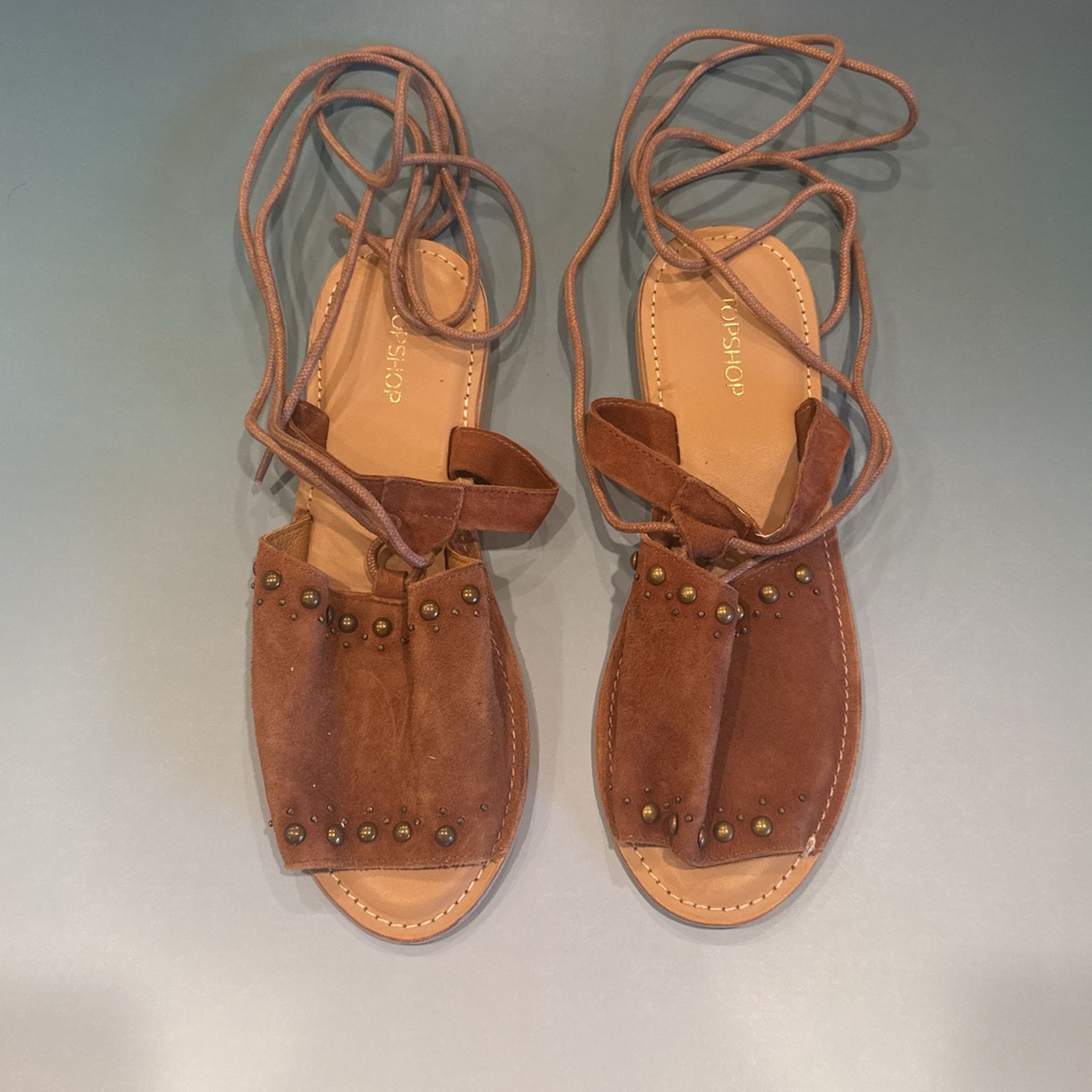 New Topshop Hope Brown Studded Leather Open Toe Tie Up Laces Sandals Size 8