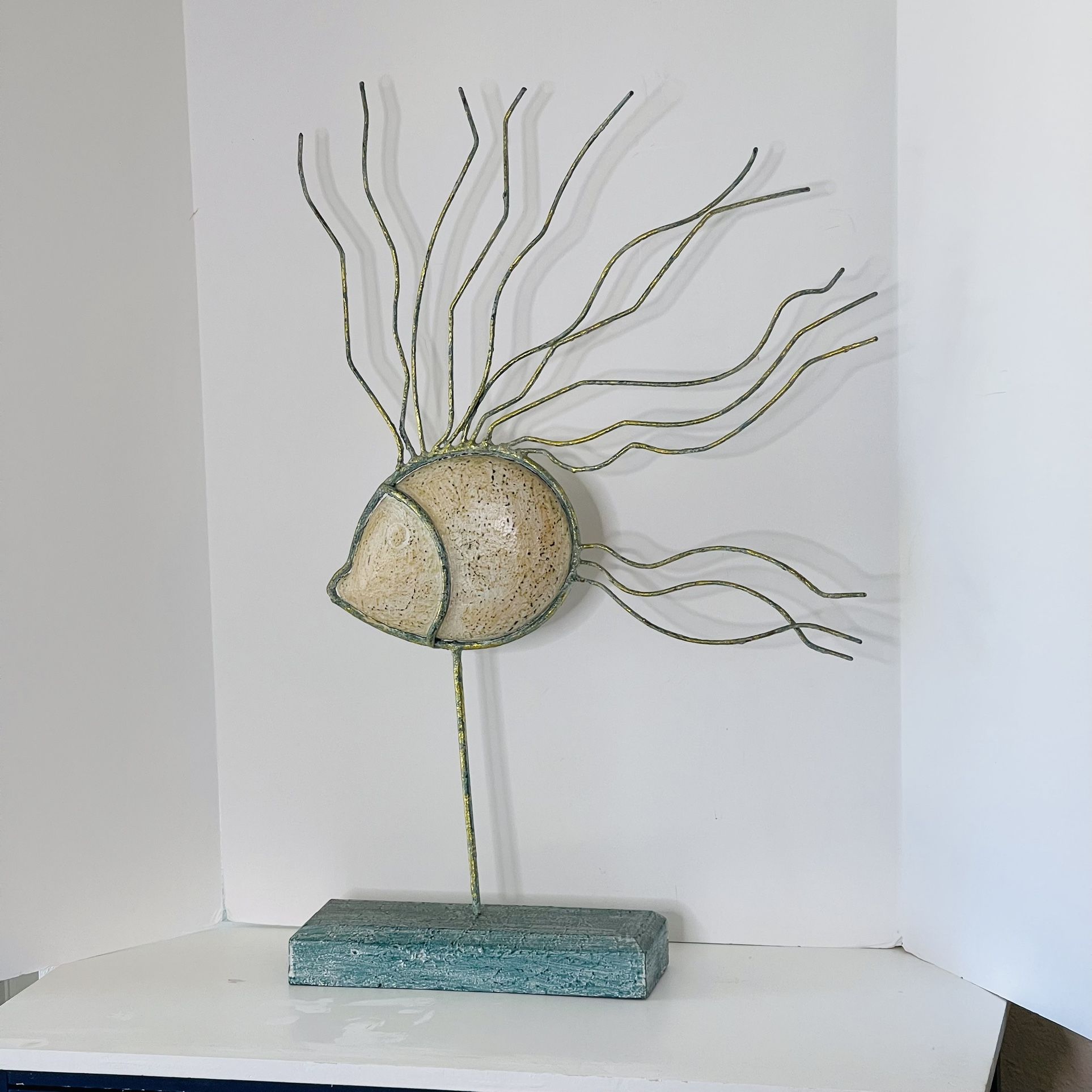 Fish on Stand Sculpture Figurine center piece, Nautical Stoneware Metal 29.5’’ Tall