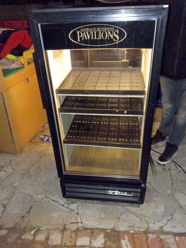 This is a true single door pass through glass display refrigerator unit. It is in great working condition. Access from both sides of refrigerator with two glass doors one on each side. Approximately 5 ft tall by 27 in wide. Perfect for any restaurant or catering business.