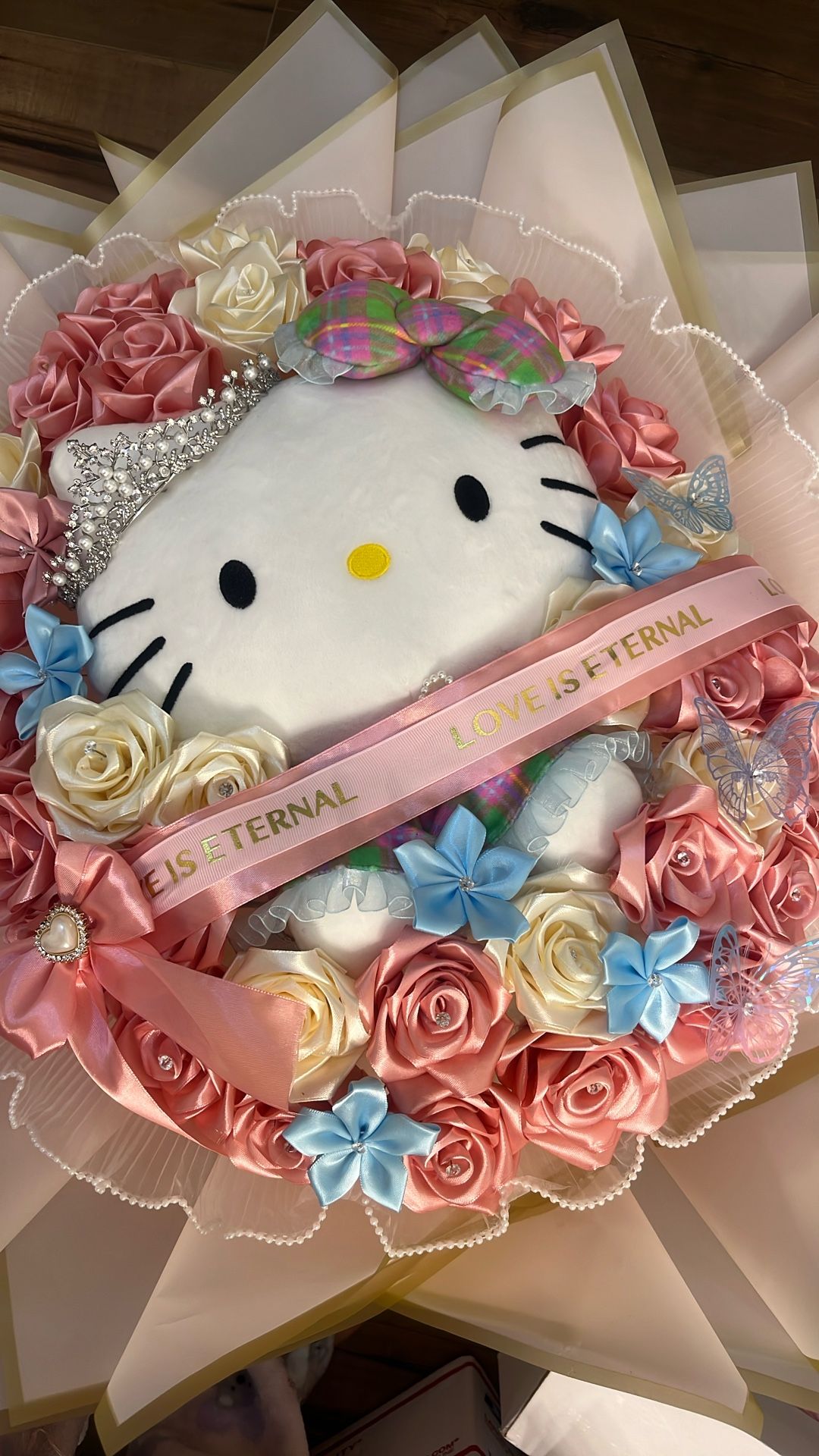 Handmade ribbon flower bouquets💐/ramos de rosas de Liston echas a mano para toda ocasión. I have this one ready to go. Hello kitty bouquet (35 eternal roses )