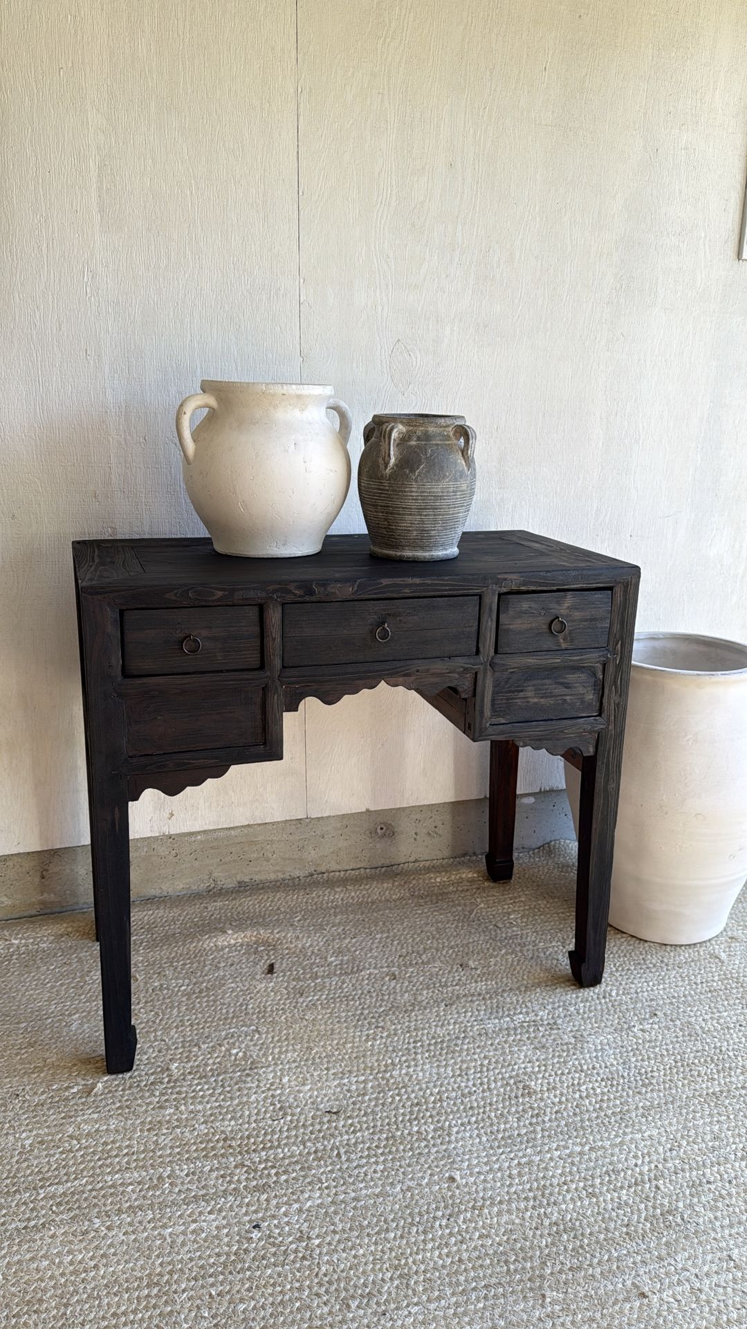 Antique elmwood desk featuring three drawers with iron ring pulls and beautifully carved scalloped trim. The rich, dark finish highlights the natural grain, while the clean lines and delicate detailing create the perfect balance between masculine depth and feminine softness. A timeless piece that works effortlessly in a variety of places! Dimensions- 37” l 33” h 18.5” d Keywords- Antique, primitive, vintage, solid wood, rh, primitive, wooden, elm, French, pine, old, Restoration hardware, pottery barn , crate and barrel
