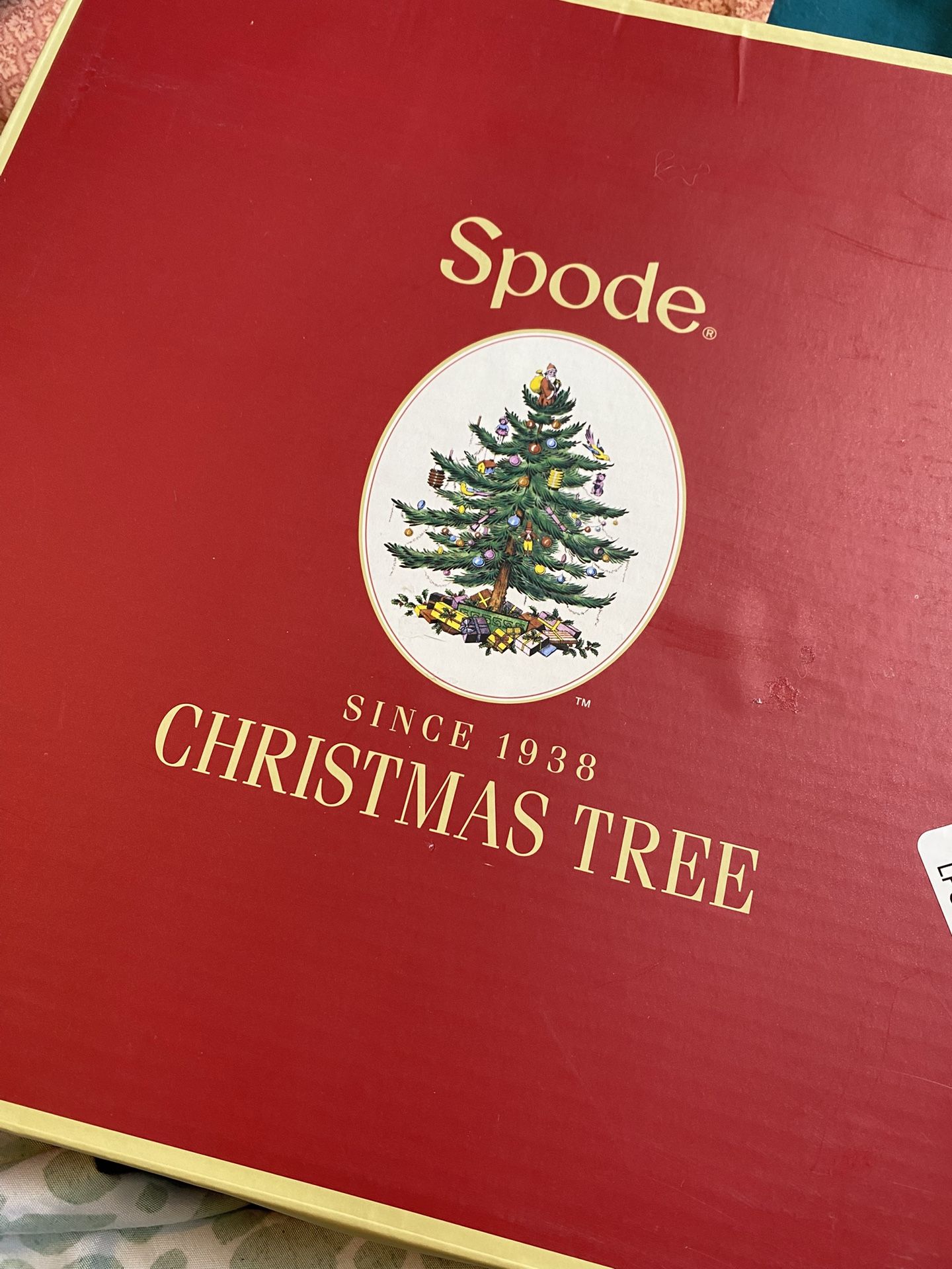 Brand new item. 4 Spode Christmas Tree 10.5” Dinner Plates in original box. Small ding on box but plates are all intact. Picture included to show box ding.