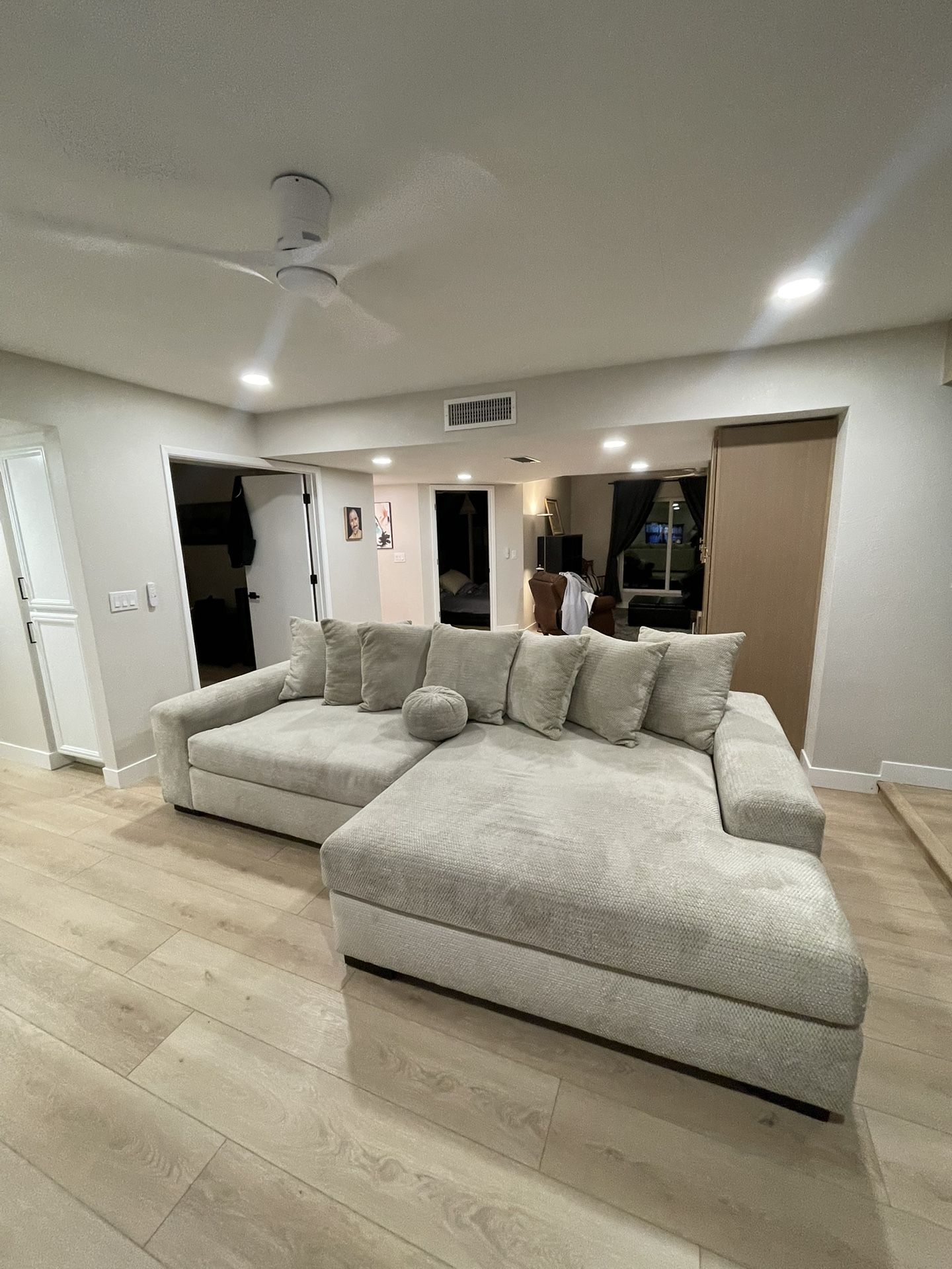 Cream deep seated sectional with chaise. Modern design. 2.5 years old. Brand new condition. 120 inches wide. Chaise 70 inches deep. Back 27.5 tall. Seat 16.5 tall