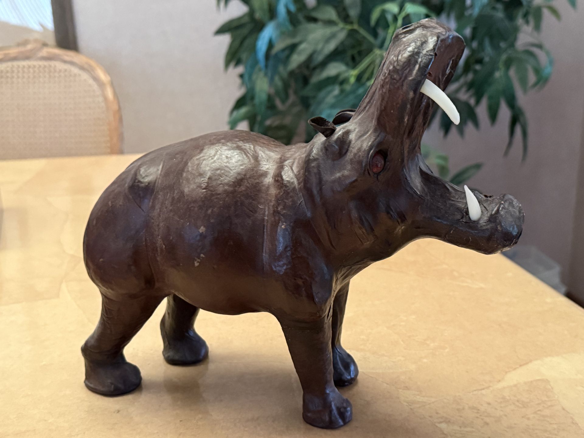 Unique large vintage hippo sculpture with a warm brown finish and handcrafted character. This is a hollow decorative piece, lightweight but substantial in size — about 12 inches long. Perfect for safari décor, bookshelf styling, or as a fun statement accent. Condition note: missing two teeth (see photos), priced accordingly. Pickup: Escondido Payment: Cash only ⸻
