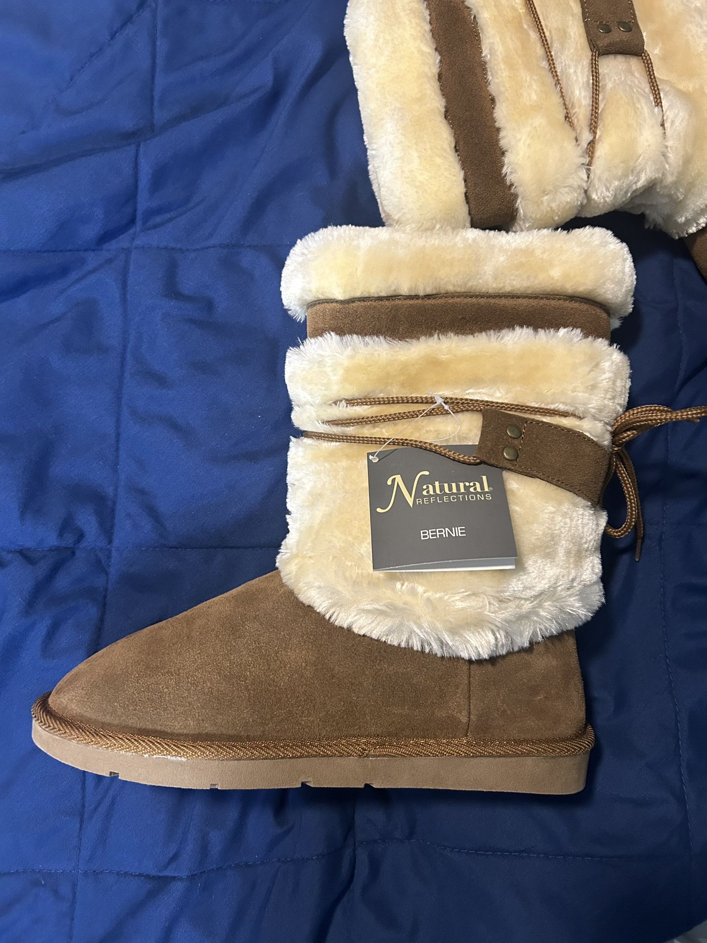 New never worn. Natural Reflections Bernie Shearling boots, brown suede upper with a cream faux-fur lining. size 9