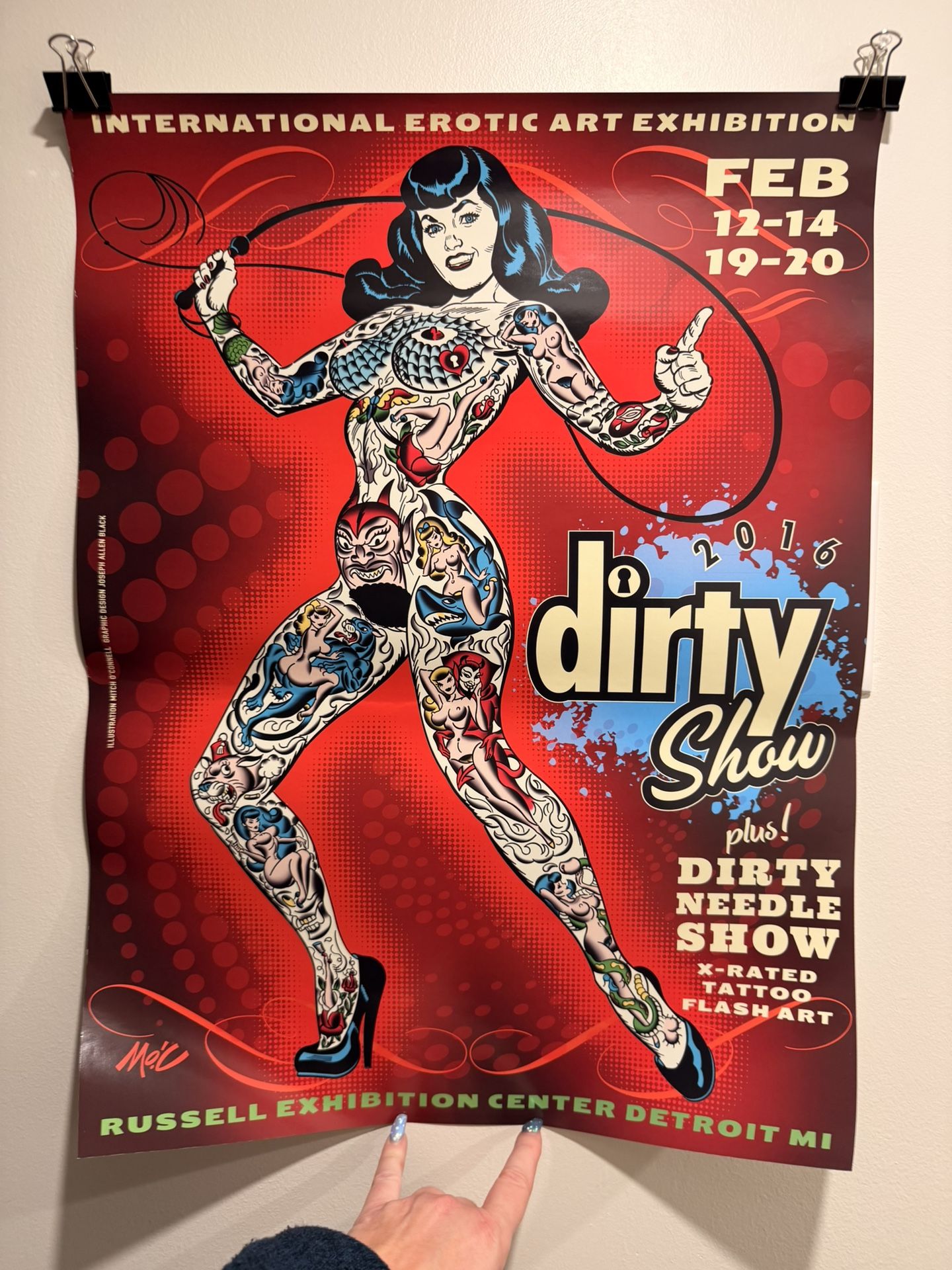 Great poster artwork by Chicago artist, Mitch O'Connell Bettie Page style pin up covered in tatttoos International Erotic Art Exhibition 2016 Dirty Show and Dirty Needle Show Russell Exhibition Center Detroit, Michigan 18" x 24"