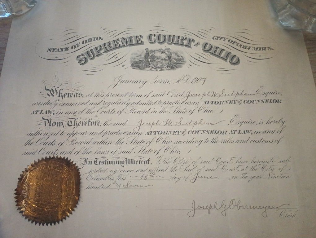 Antique Certificate To Practice Law Supreme Court Ohio C. 1907