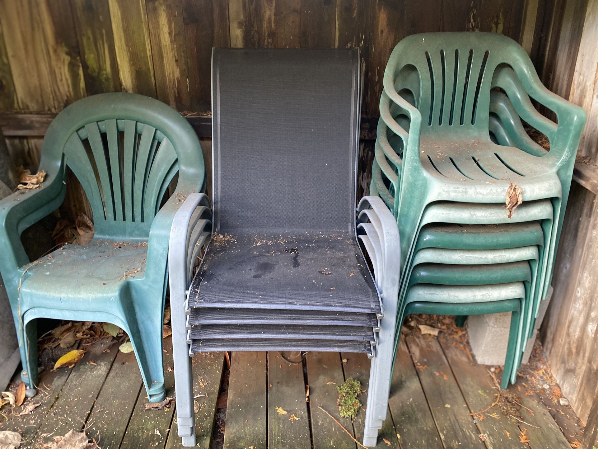 Four deck chairs that have been stored and are in good condition plus plastic chairs