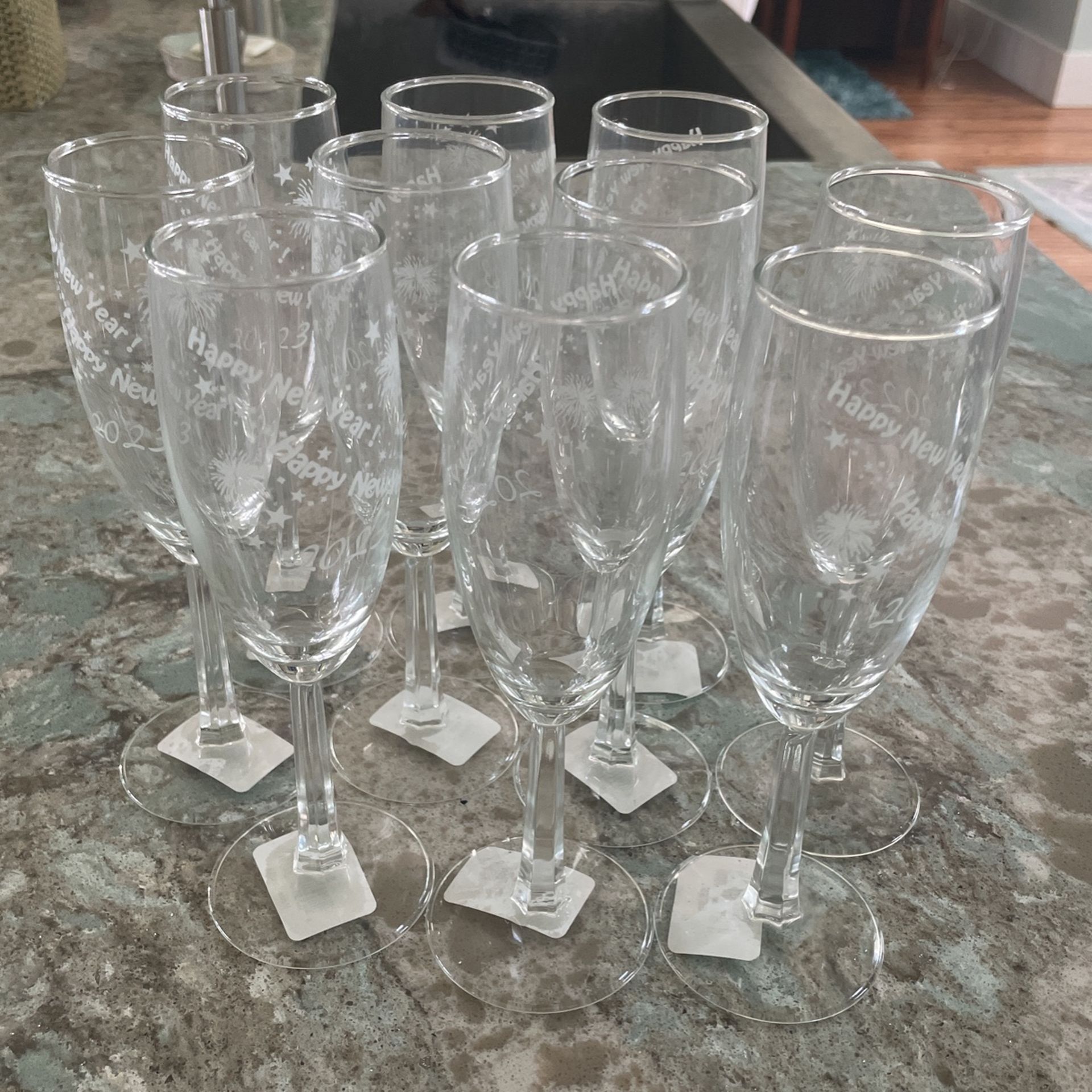 Set of 10 champagne flutes that say “Happy New Year 2023”