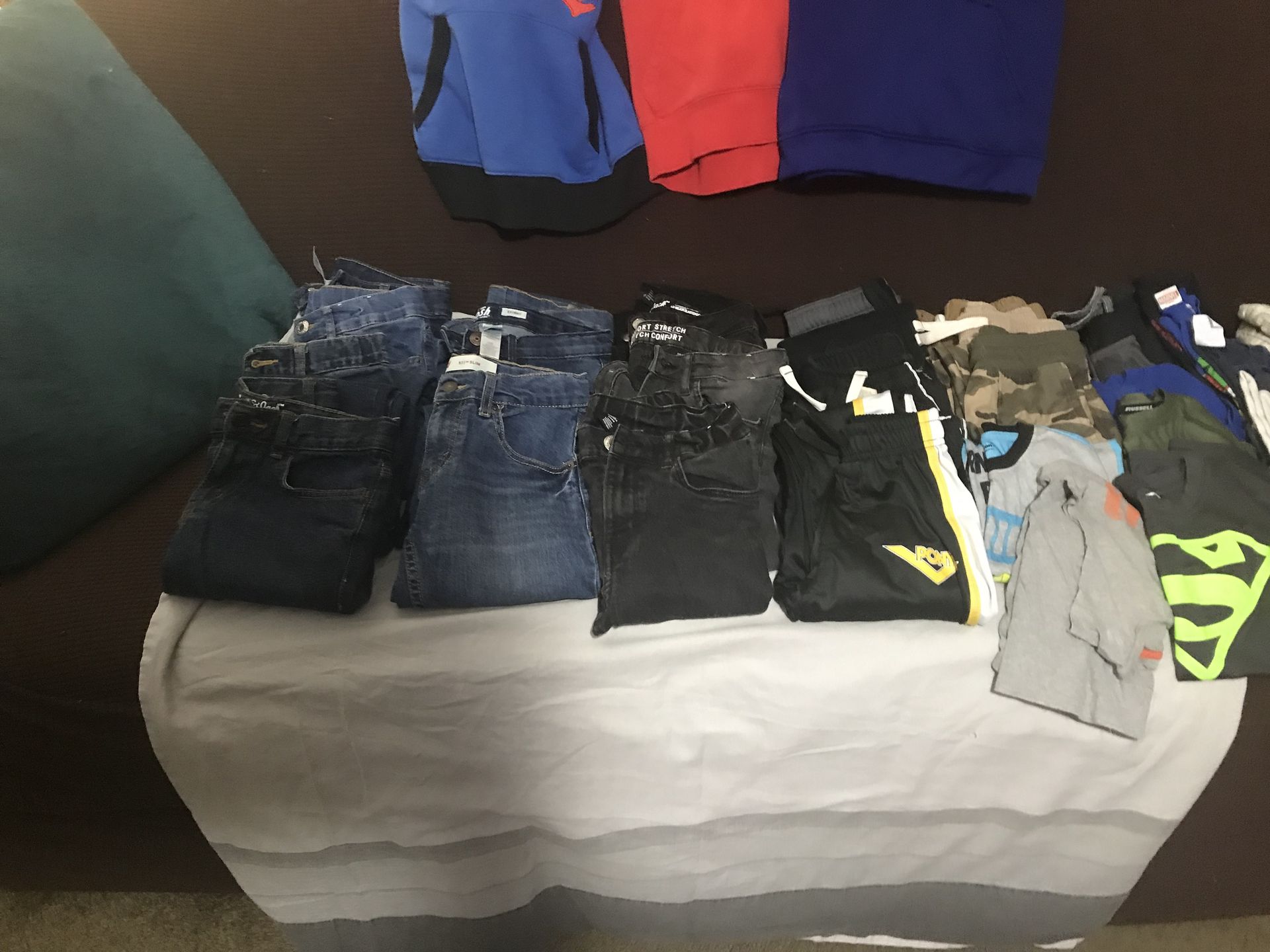Boys clothing bundle sizes 7, 8, 10 & 12 All pieces have no stains, holes or snags, they come from a pet free & smoke free home! 39 pcs total 7 prs of Bluejeans 4 black jeans 3 tie up waist pants 4 sweat pants 4 long sleeve pull over shirts 1 pajama shirt 2 button flannel shirts 1 tank top 6 short sleeve t-shirts 3 swim shorts 1 jean short 3 pull over hoodies 1. Under Armor 1. Champion 1. Jordan
