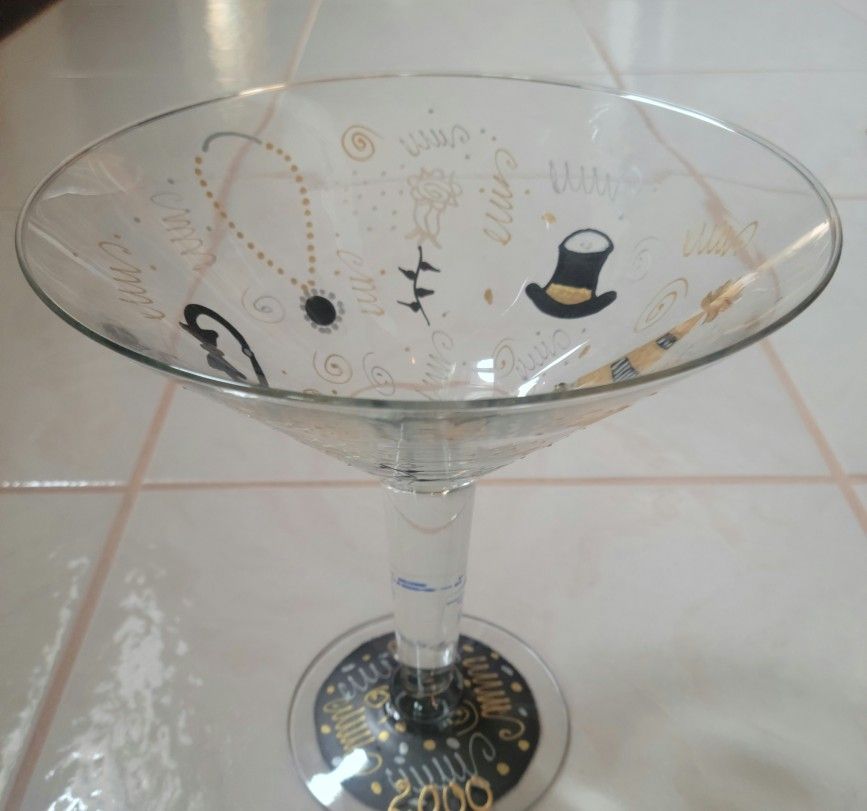This is a gorgeous one of a kind extra large Smithereens Martini Glass signed Vikki99 in pristine condition. The colors are gold, black, white and silver. This was used only as a display, in excellent/new condition. The Smithereens care tag is still on the stem and the glass is uniquely handpainted in a fun design of partying; it even has a gold crystal as part of a necklace! The size is 10" High and the glass is 4 1/2" and the glass is 9" wide across. Base 5 1/2". What a great gift at a fraction of the cost!