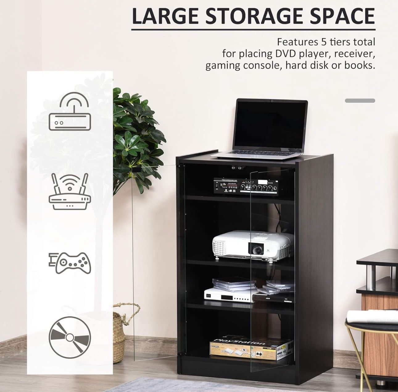 Modern black glass media cabinet in excellent condition—fully assembled and ready to use. Sleek design with four spacious tiers, perfect for organizing electronics, books, or decor. - Tempered glass doors with push-to-open latch - Remote signals work through the glass - Adjustable shelves (3 levels) for flexible storage - Built-in cable management holes in back - Great for gaming setups, receivers, consoles - Clean black finish with woodgrain texture - No cracks, no damage Dimensions: 21.25” W x 15.75” D x 35.75” H Weight Capacity: 66 lbs total / 11 lbs per shelf Already built and ready to go. Pickup in Edgewater, Miami (33137). I can help load.