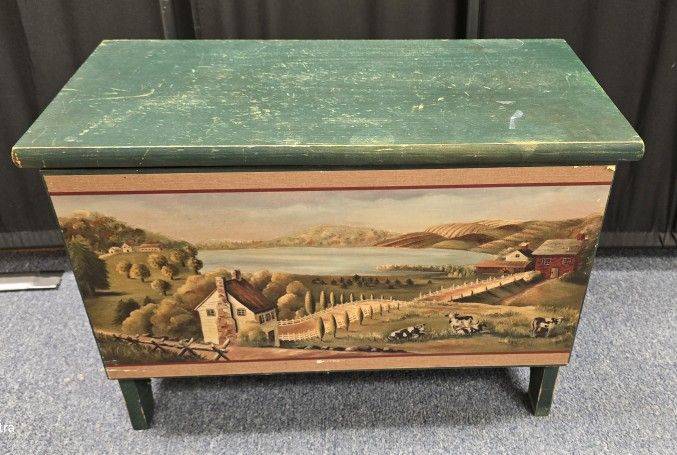 Great little chest with a country farm scene for storing whatever. 22"w x 11"d x 16"h 10" inside depth