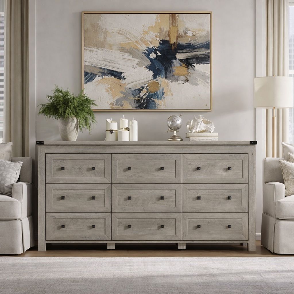 New Premium Dresser for Bedroom with 9 Drawers, Farmhouse Wood Chest of Drawers, Wide TV Stand Closet Storage Furniture with Metal Handle, Modern Clot