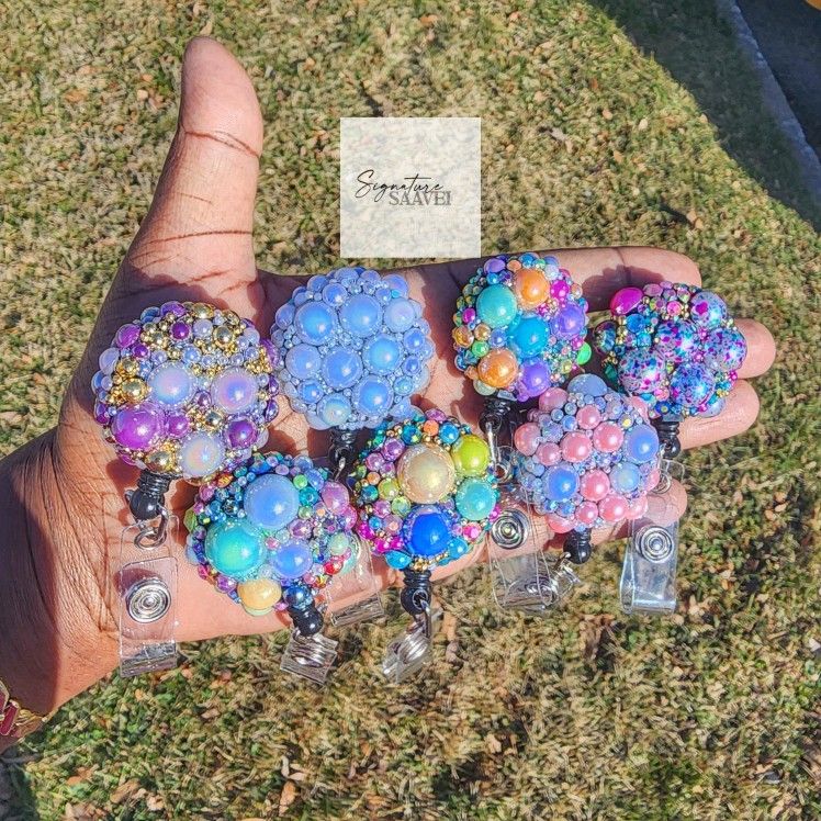 ✨️Description of Product✨️ BRAND NEW Custom Retractable Work/ID Badge The price is $15 per Work/ID Badge Please specify which color scheme you wish to have prior to purchasing via message to make sure it's still available Hand placed pearls of all sizes and colors Durable
