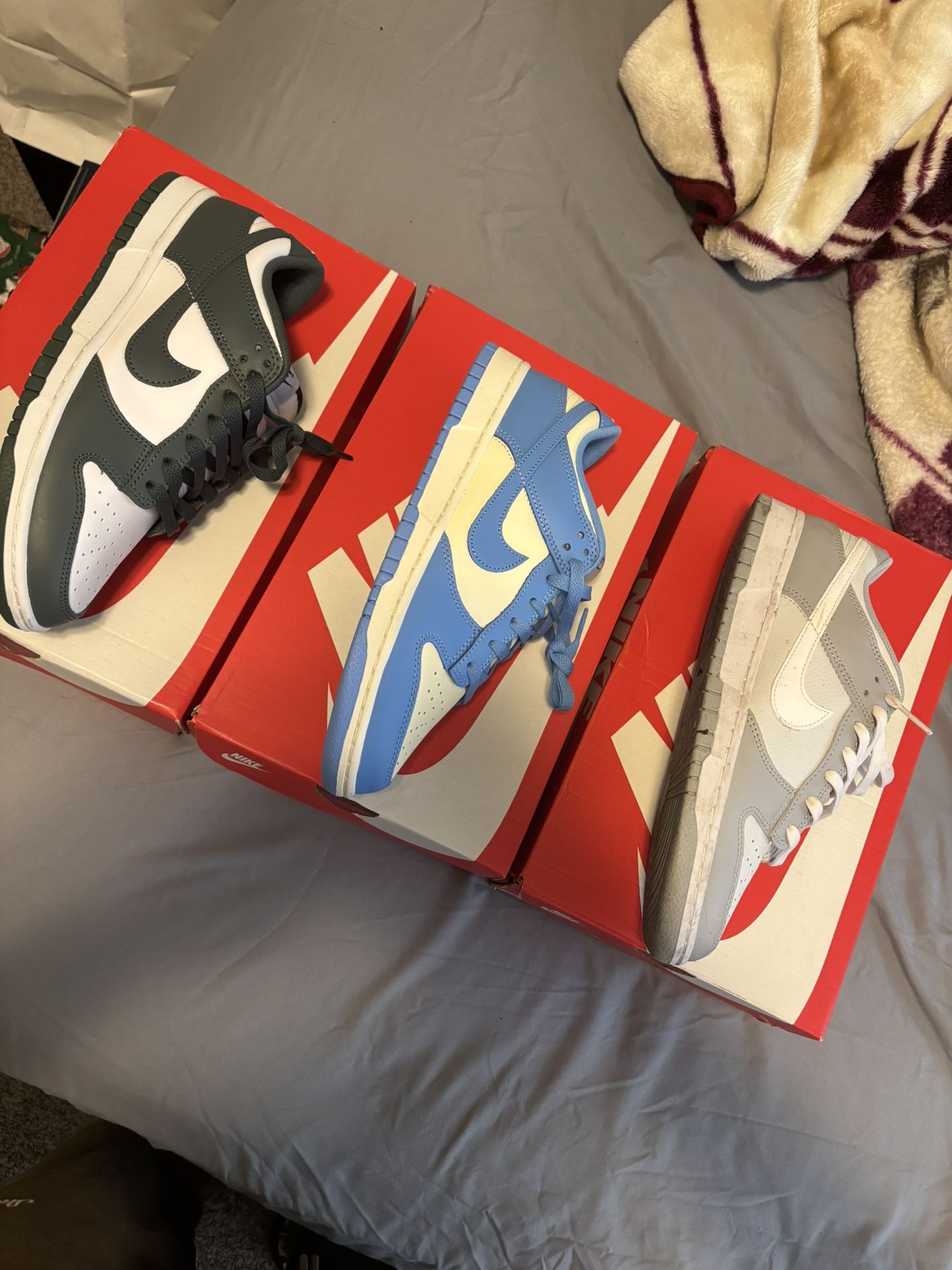 Green size 8.5 9/10 worn 1x Baby blue size 9 10/10 just tried on Grey size 9 8/10 (needs a quick wipe down and it’ll be 9/10 easily) All shoes comes with OG ALL I’ll trade all 3 pairs for something of my interest in a size 9