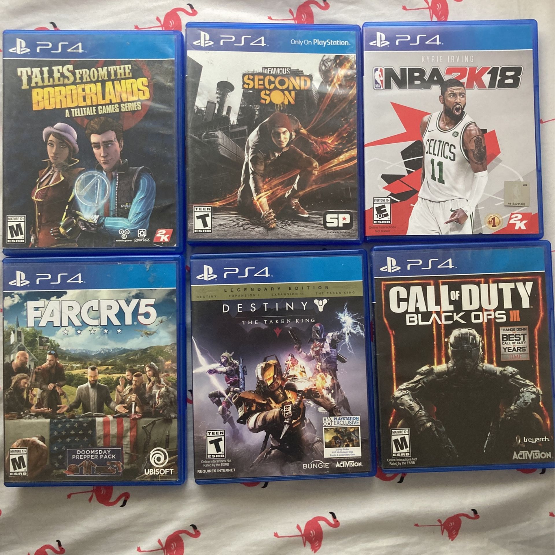 Slightly used games Buy separately or buy all for $120 Tales from the Borderlands - $15 Infamous: Second Son - SOLD NBA 2k18 - $15 FarCry 5 - $16 Destiny: The Taken King legendary edition - $34 Call of Duty Black Ops 3 - $18 Uncharted Drake’s Fortune - $12 Turok - $10