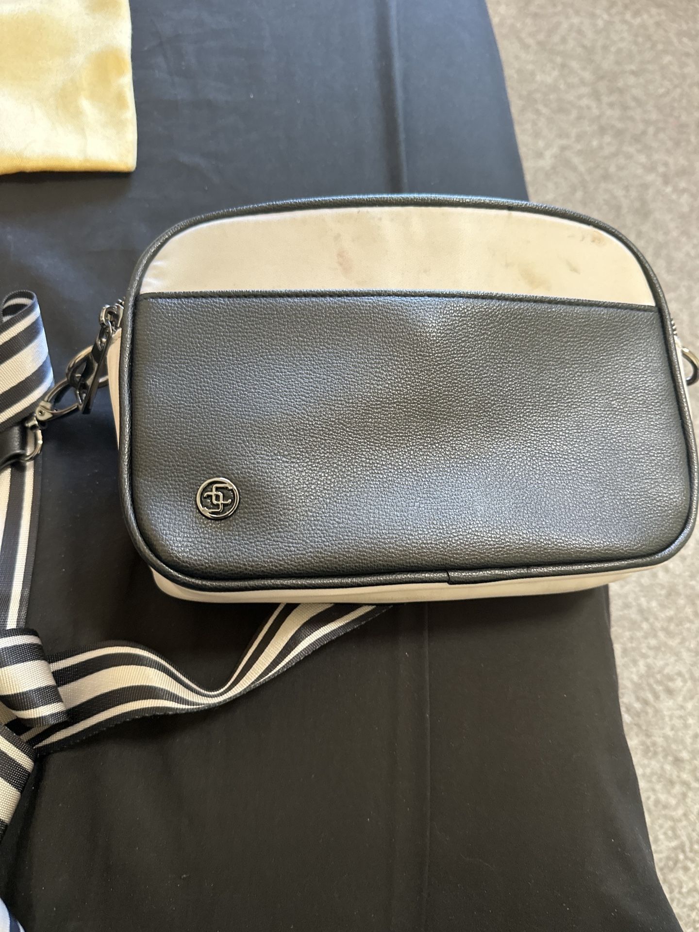 Pre-owned Chico’s crossbody bag with a stylish black and white two-tone design and adjustable striped strap. • Brand: Chico’s • Zipper closure • Adjustable crossbody strap • Lightweight and practical for everyday use ⚠️ Condition: The bag has visible stains on the outside and inside (see photos). Still functional and great for casual use or someone who wants to clean/restore it. Pickup available.