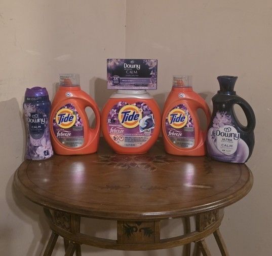 2 Tide Detergent-73 FL OZ 1 Tide POWER PODS-25 XL 1 Downy CALM Scent Booster-13.4 FL OZ 1 Downy CALM Fabric Softner-56 FL OZ 1 Downy CALM Dryer Sheets-50 Sheets