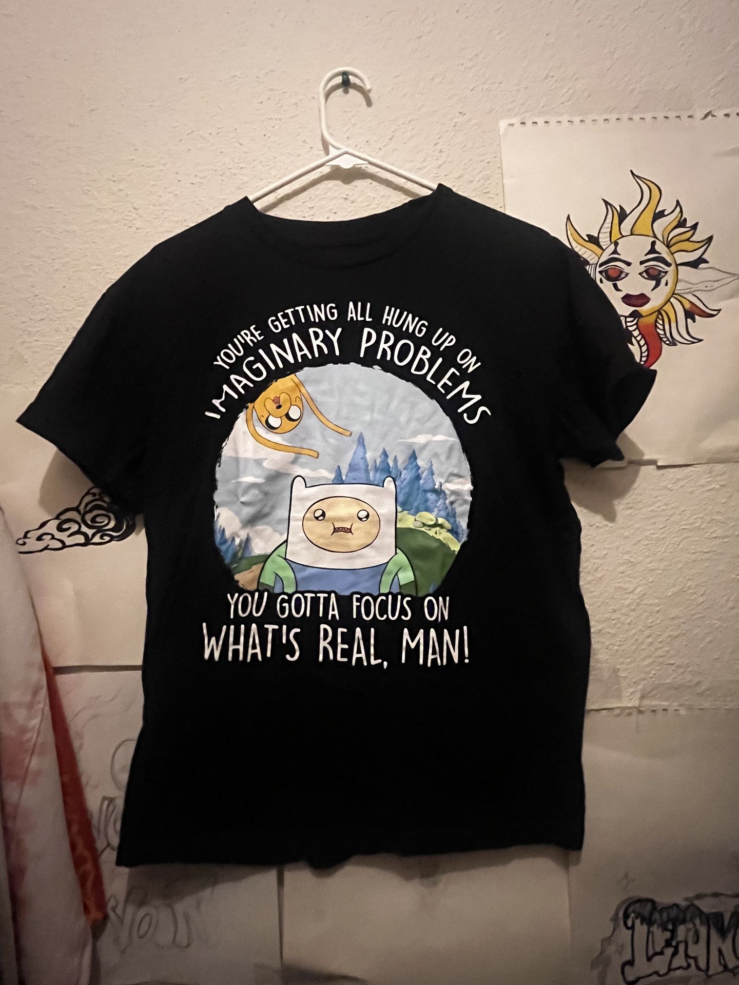Size: M Soft black tee featuring Finn and Jake graphic and playful slogan. Comfortable cotton-blend for everyday wear. Bold printed artwork adds fun character to any outfit. Machine washable for easy care.