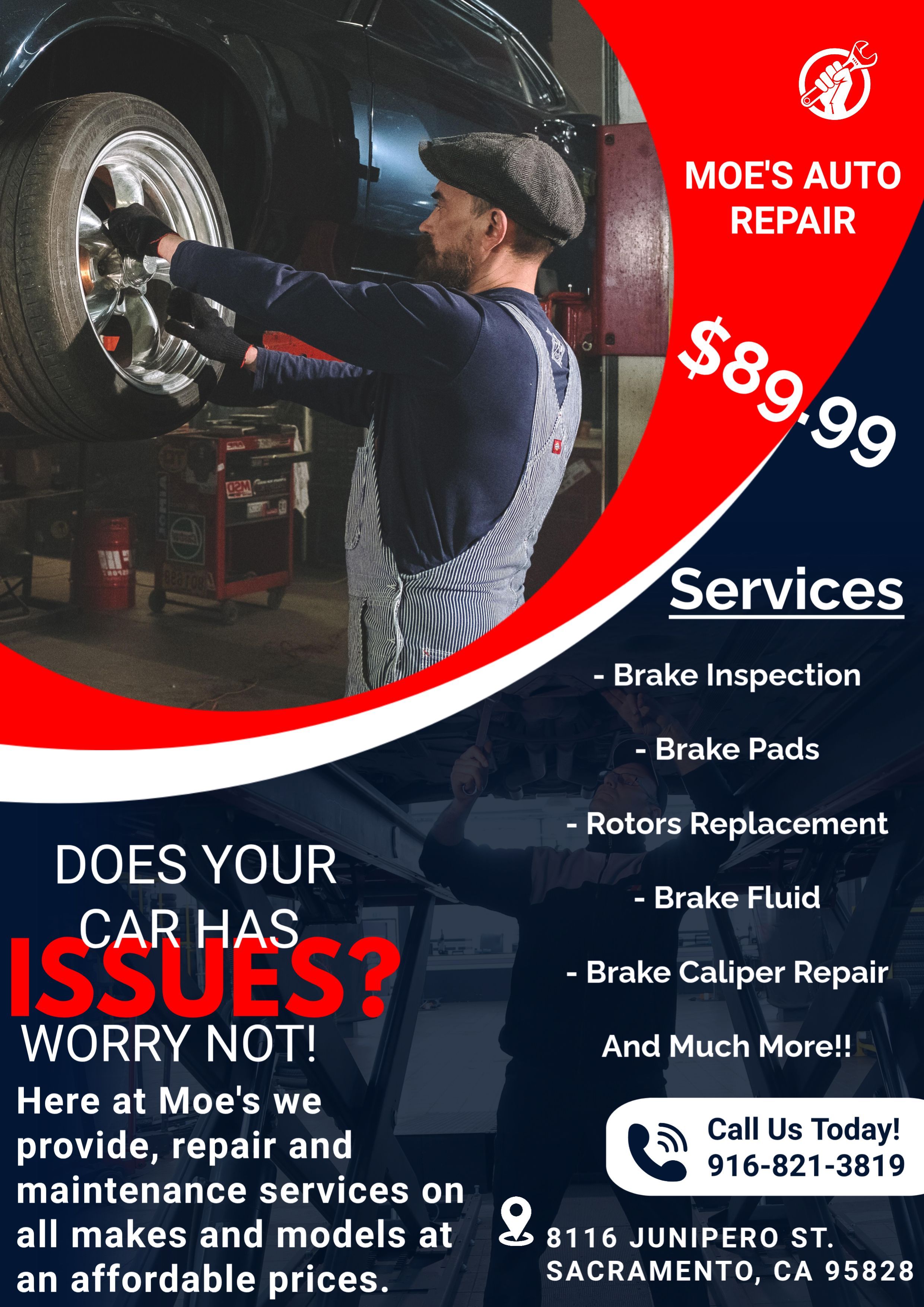 Our shop is having a Special Sale on Brake Pads $89.99 Front Brake pads and labor $89.99 Rear Brake pads and labor Toyota - Honda - Nissan - Chevy - Hyundai - Ford BMW - Mercedes - Jeep - Dodge - Chrysler and more We also provide general auto repair Scheduled Maintenance Engine swap (auto) Engine swap ( Trucks & SUV) Transmissions Axels Shocks & Struts Computer Diagnosis Computer Relearn Oil change Coolant System Services Tune ups Alignment Ac repair Ac recharge Power train Battery Replacement Oxygen sensors Catalytic converters Ignition coils Thermostats Sensors ETC................. WE DO IT ALL !! Call Us Now: 916-738-5797 or 916-821-3819 Licensed And Insured Shop