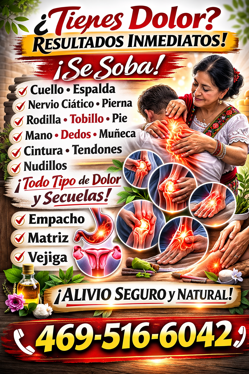 Tienes dolor resultados inmediatos? se soba cuello espalda nervio ciático pierna rodilla tobillo pie mano dedos muñeca cintura tendondes nudillos todo tipo de dolor y secuelas empacho matriz vejiga (contact info removed)