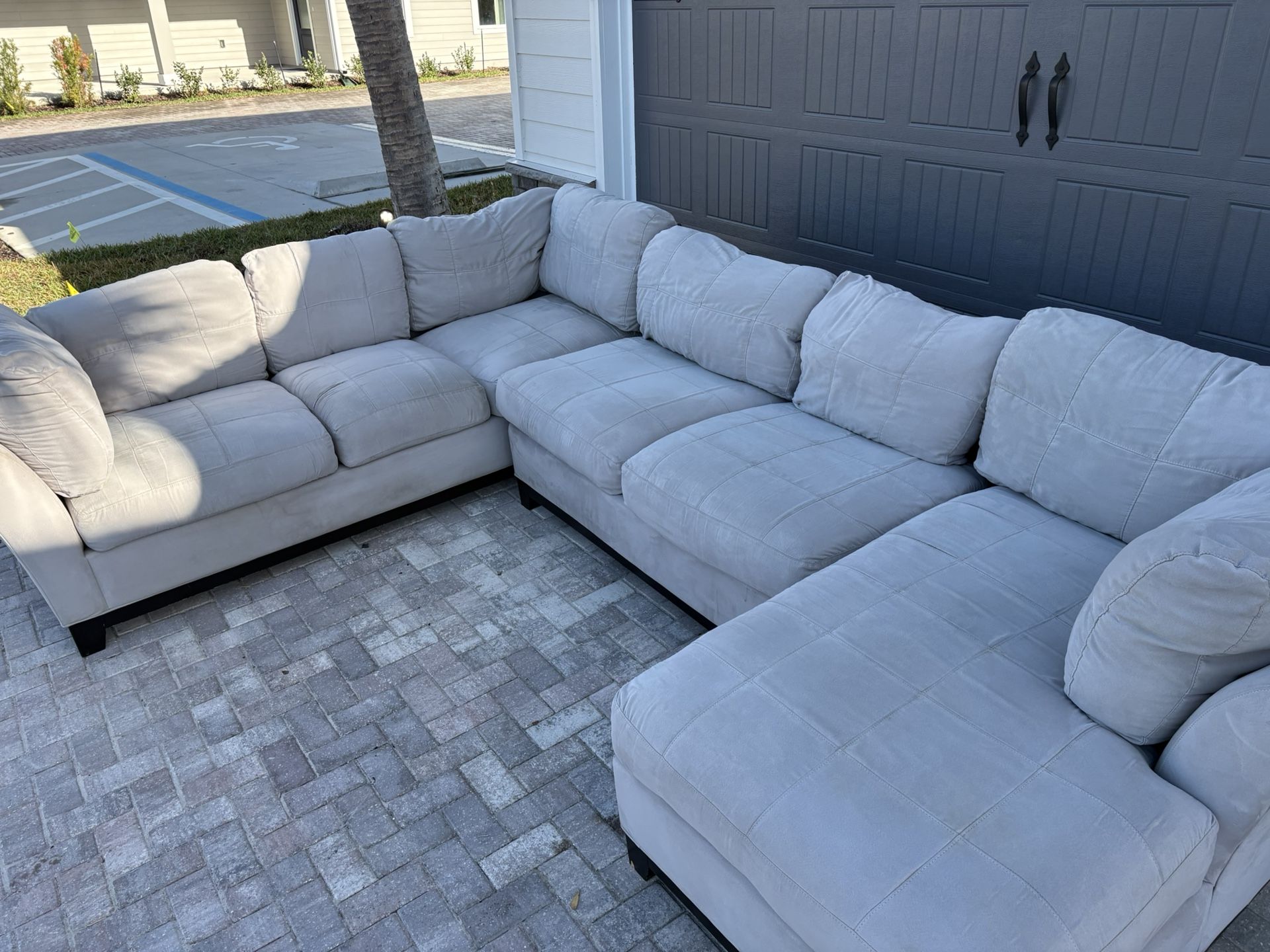 Beautiful oversized sectional sofa from Cindy Crawford Home. Features: • Authentic Cindy Crawford Home furniture • Large modular sectional configuration • Chaise lounge section • Deep comfortable seating • Neutral light fabric • Removable back cushions • Solid wood legs • Very sturdy frame Condition is very good overall with some manageable wear from use. Recently cleaned (although I may have missed a spot or two) and presents very nicely. Approximate size: • Seats 5–6 people comfortably • Large sectional footprint Pickup required, but delivery may be available locally for a small fee.