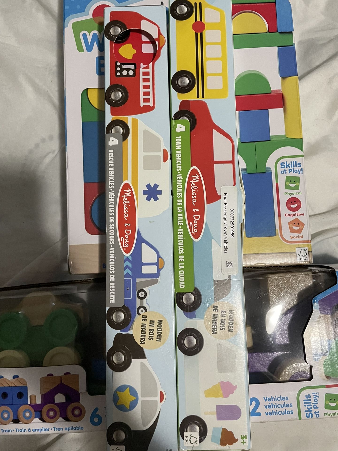 Melissa and Doug train- $20 Melissa and Doug blocks $15 Cars-$5 Or everything for $40