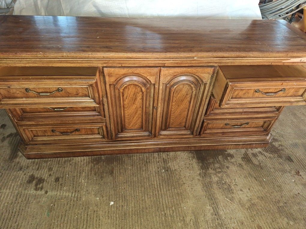 Wooden Dresser heavy duty and in good condition. It does have a scrape on the upper right side that could use some wood filler and 2small scratches on the bottom edge but other than that it's great. 76 inches wide. $50.