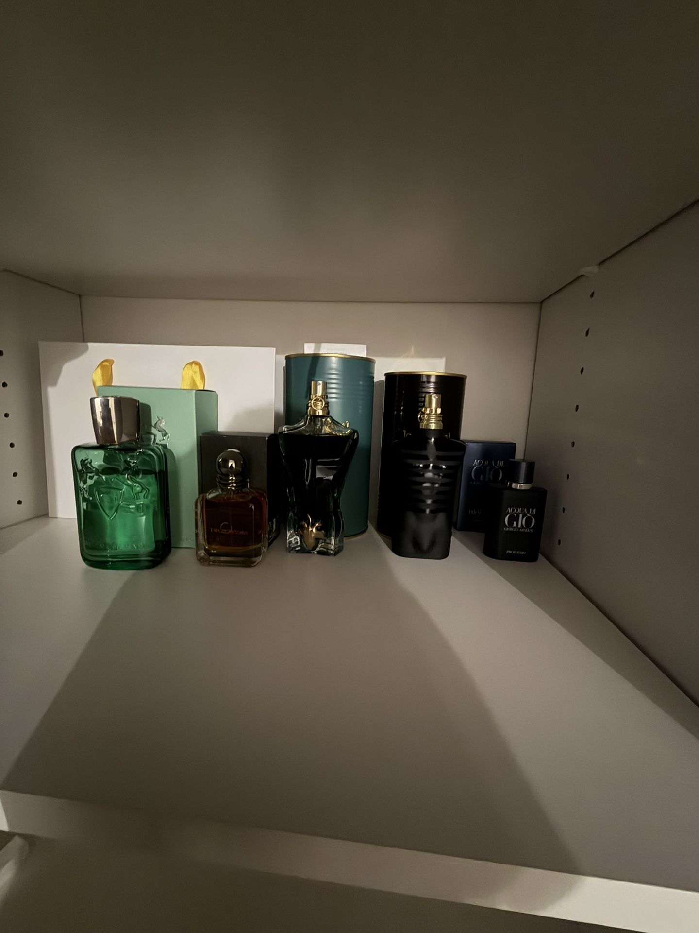 Greenly-88 percent full 125 ml Swy edt - 98 percent full 50 ml Le beau edt- 99 percent full 125 ml Le male le perfum- 97 percent full 125 ml Aqua de gio- 90 percent full 40 ml
