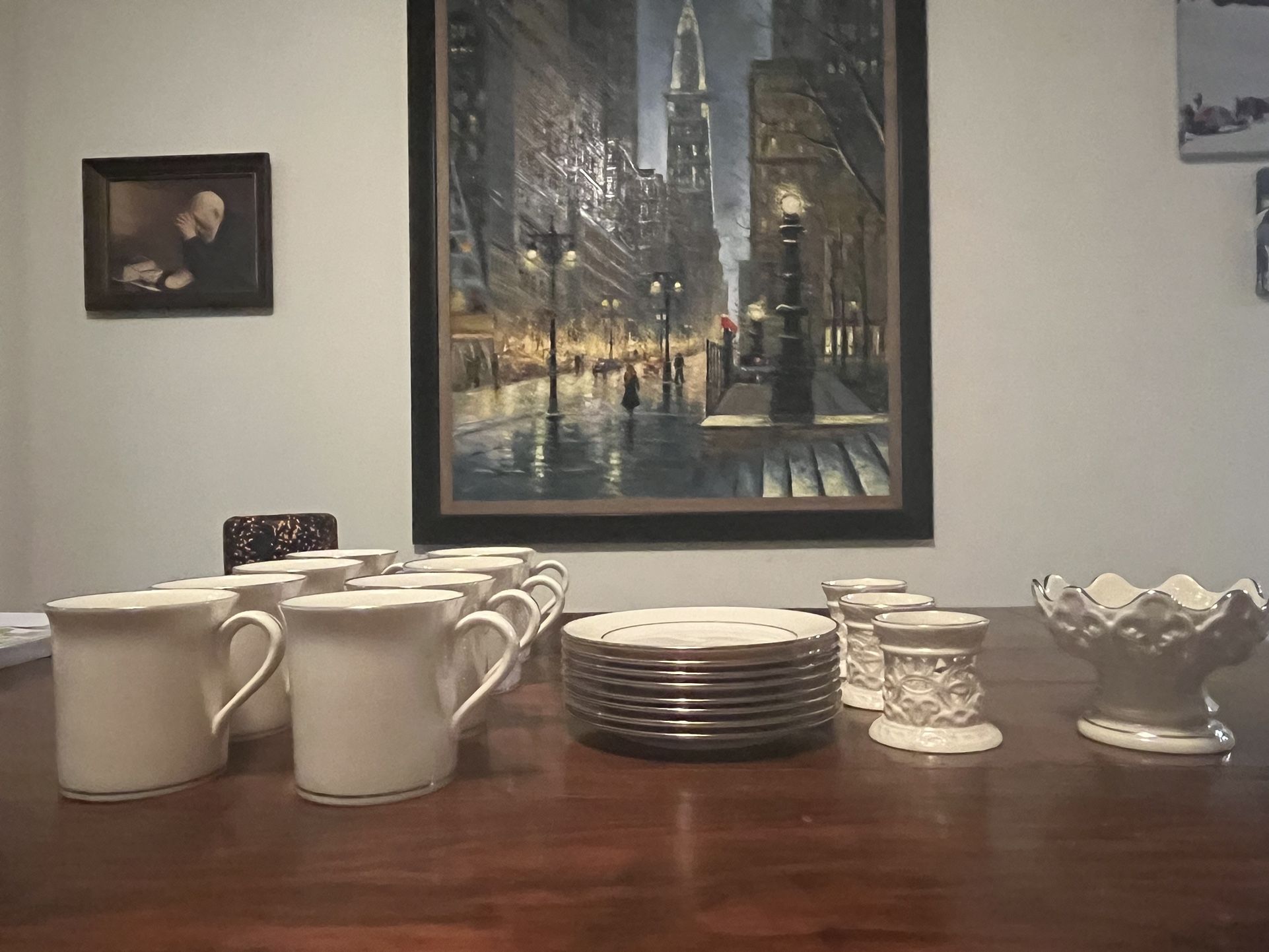 Never used - Beautiful Lenox china in the Cosmopolitan collection. 8 mugs, 8 saucers, 3 tea light candle holders, one serving dish. Never used, perfect condition. No chips, cracks, or stains. Dishes have never been used.