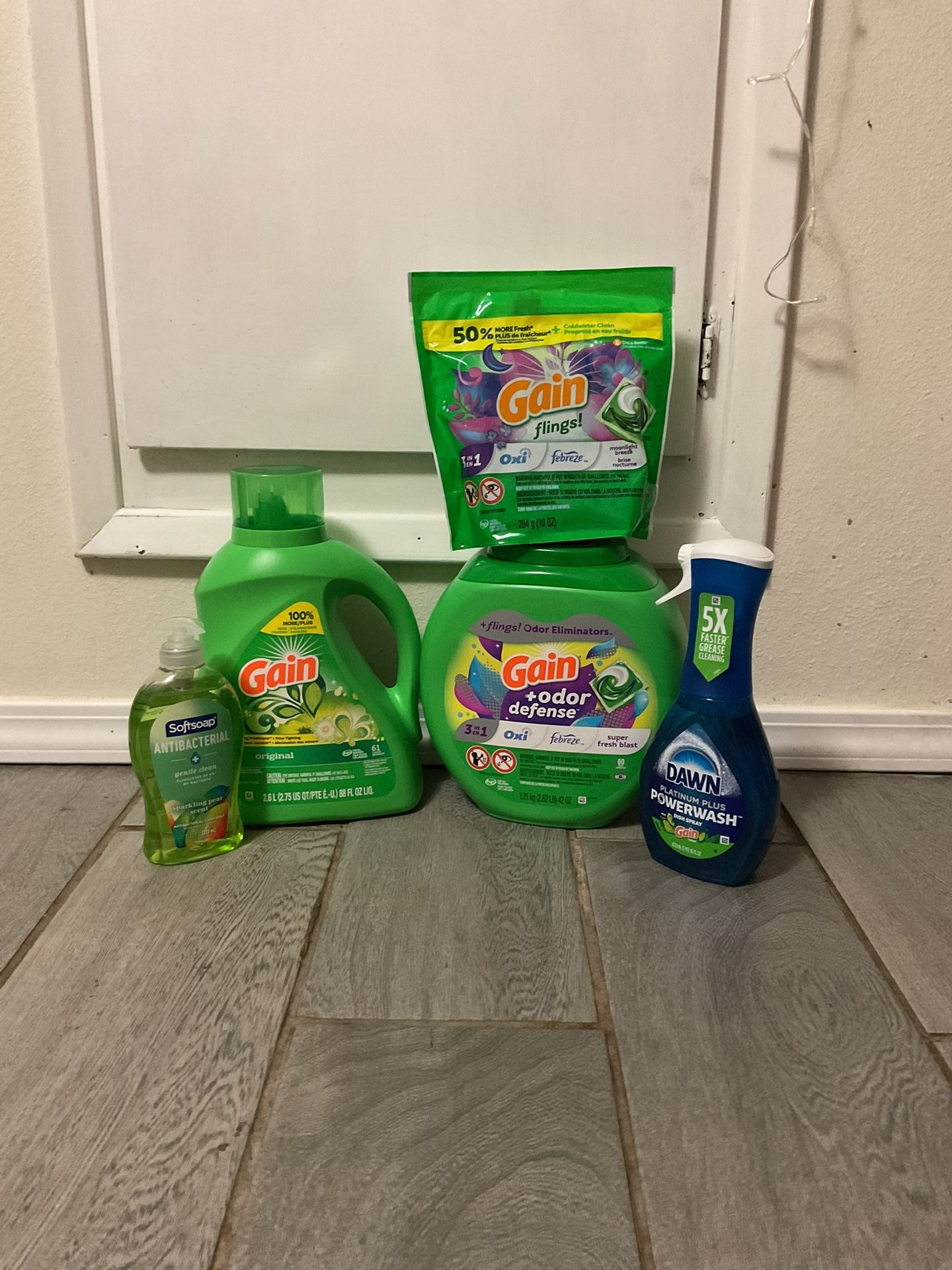 Brand new items from my stockpile never opened or used. Full Gain Home Bundle Includes: • 1 Gain Original Liquid Laundry Detergent — 88 fl oz • 1 Gain Flings! + Odor Defense Pods (60 ct) • 1 Gain Flings! Pods (14 ct) • 1 Softsoap Antibacterial Hand Soap • 1 Dawn Platinum Plus Powerwash Spray — Gain scent 🏠 Smoke-free home 🛍 Bags available upon pickup 💵 Cash (preferably) Zelle or CashApp 🚫 Pickup only — Lakewood area (address provided on day of pickup) First come, first served