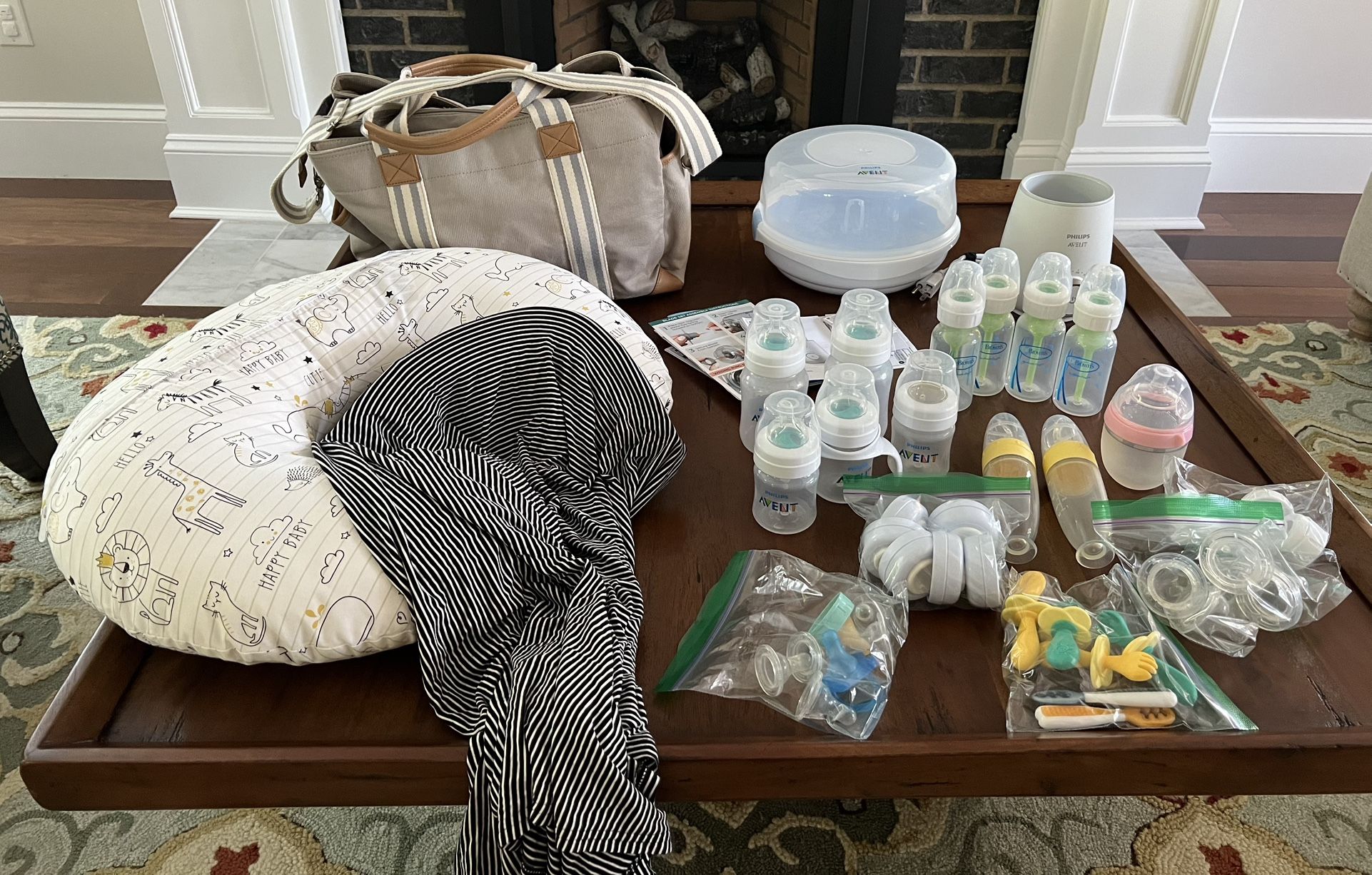 Pottery Barn diapers bag, Philips Avent microwave bottles sterilizer, bottle warm, bottles and more