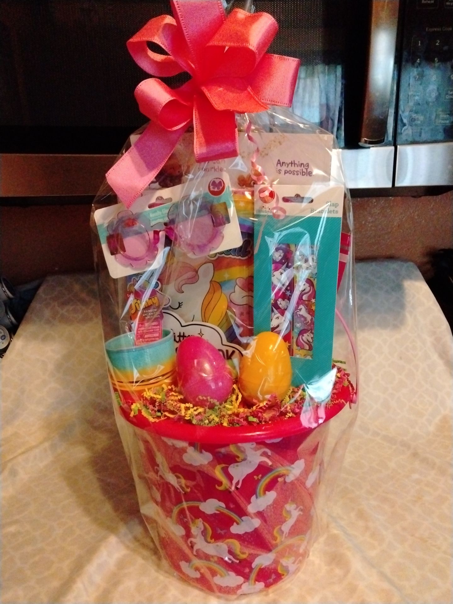Unicorn glitter sketchbook, slap bracelets, slinky, novelty glasses, Barbie toothbrush, fidget pencil case and reading book.