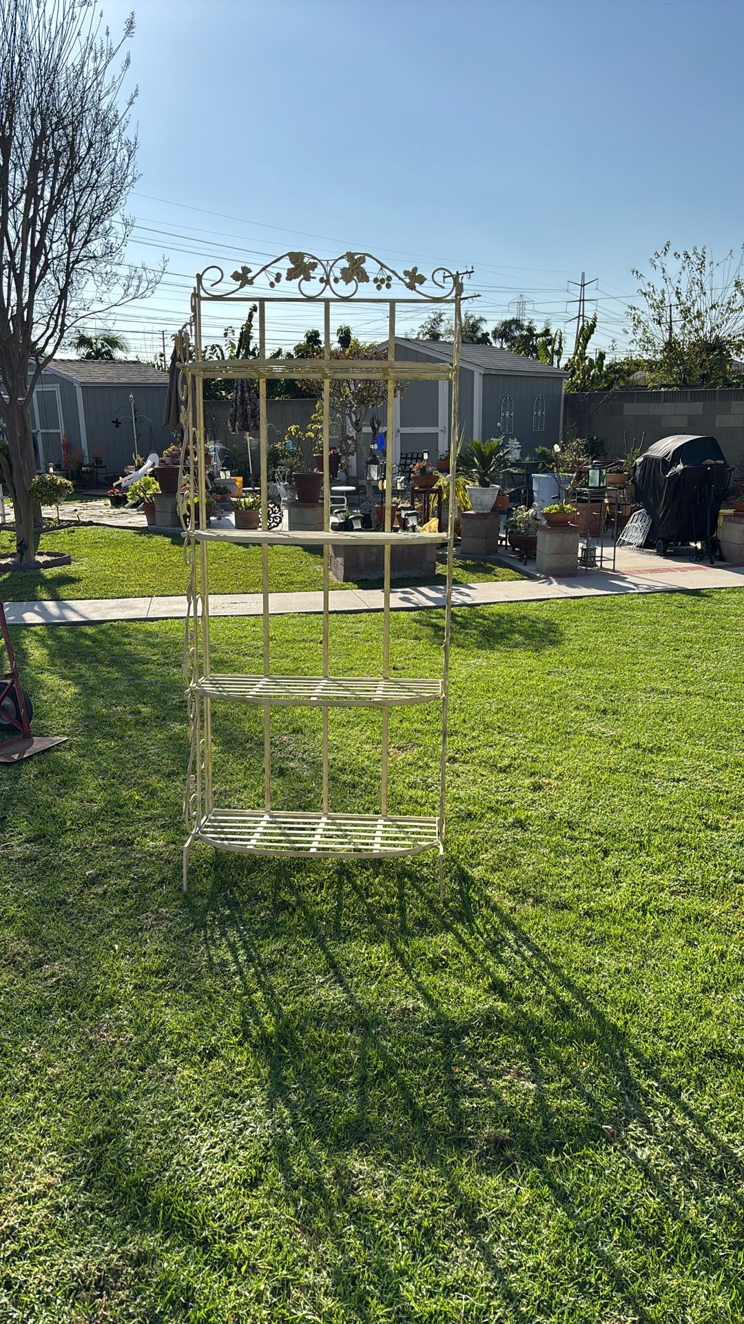 72”H x 31”W x 14” D, 4 shelves, crème colored and collapsible. Very good condition.