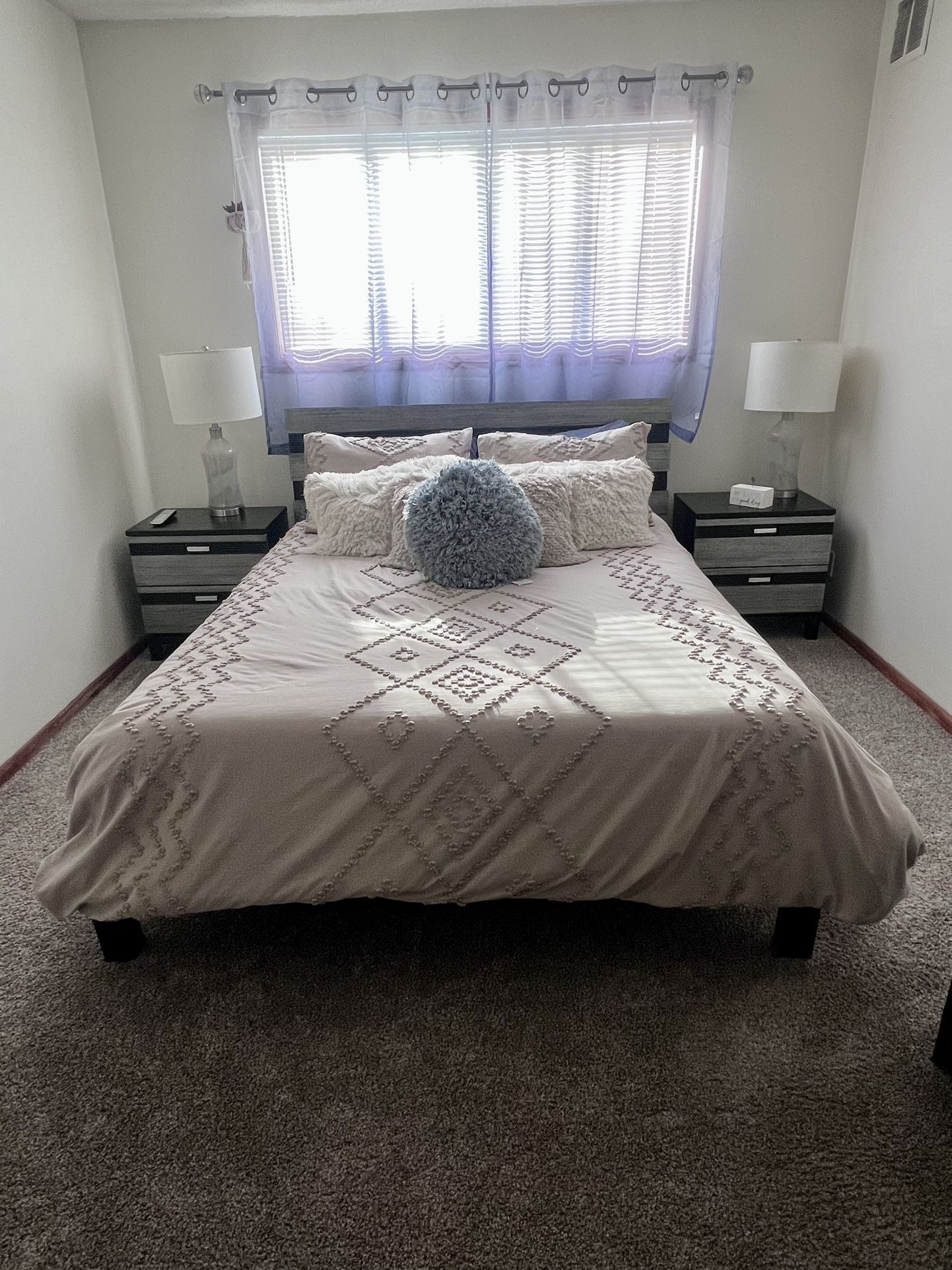 Selling my complete bedroom set including a queen size mattress with headboard and foundation (monkey bar base), two nightstands, two lamps, dresser with mirror, large art piece, curtains and curtain rod (short or floor length curtains available). Excellent condition. Smoke free home. Mirror W30” H44” Vanity with W5’ H48” (side piece H17.5” ) D17” - the mirror and top two drawers can switch sides and/or be taken off for moving. Nightstand: W22” H23” D16” Lamps: H26” Art W59”H30” Headboard and Foundation are for a standard queen. NOTE: Bedding and TV are NOT included.
