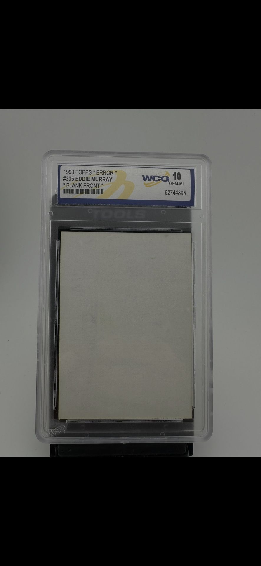 1990 Topps #305 Eddie Murray baseball card featuring a blank front production error. Grade 10.