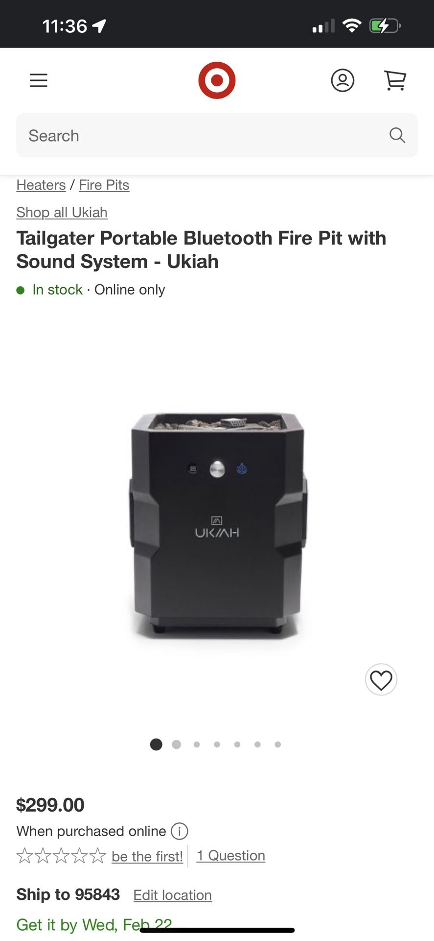 Brand new in box. Tailgater Bluetooth fire pit with sound system. Brand is Ukiah retails $299 at Target.