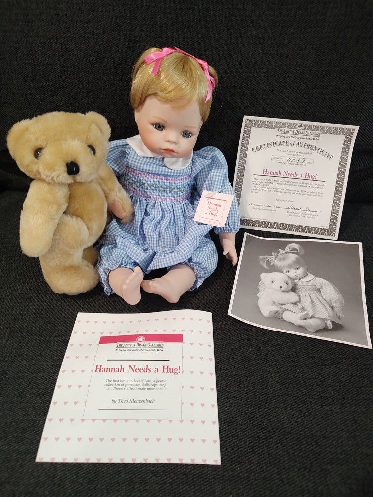 Ashton Drake Galleries Porcelain Doll "Hannah Needs a Hug". Certificate of authenticity and original box and accessories included. Excellent condition