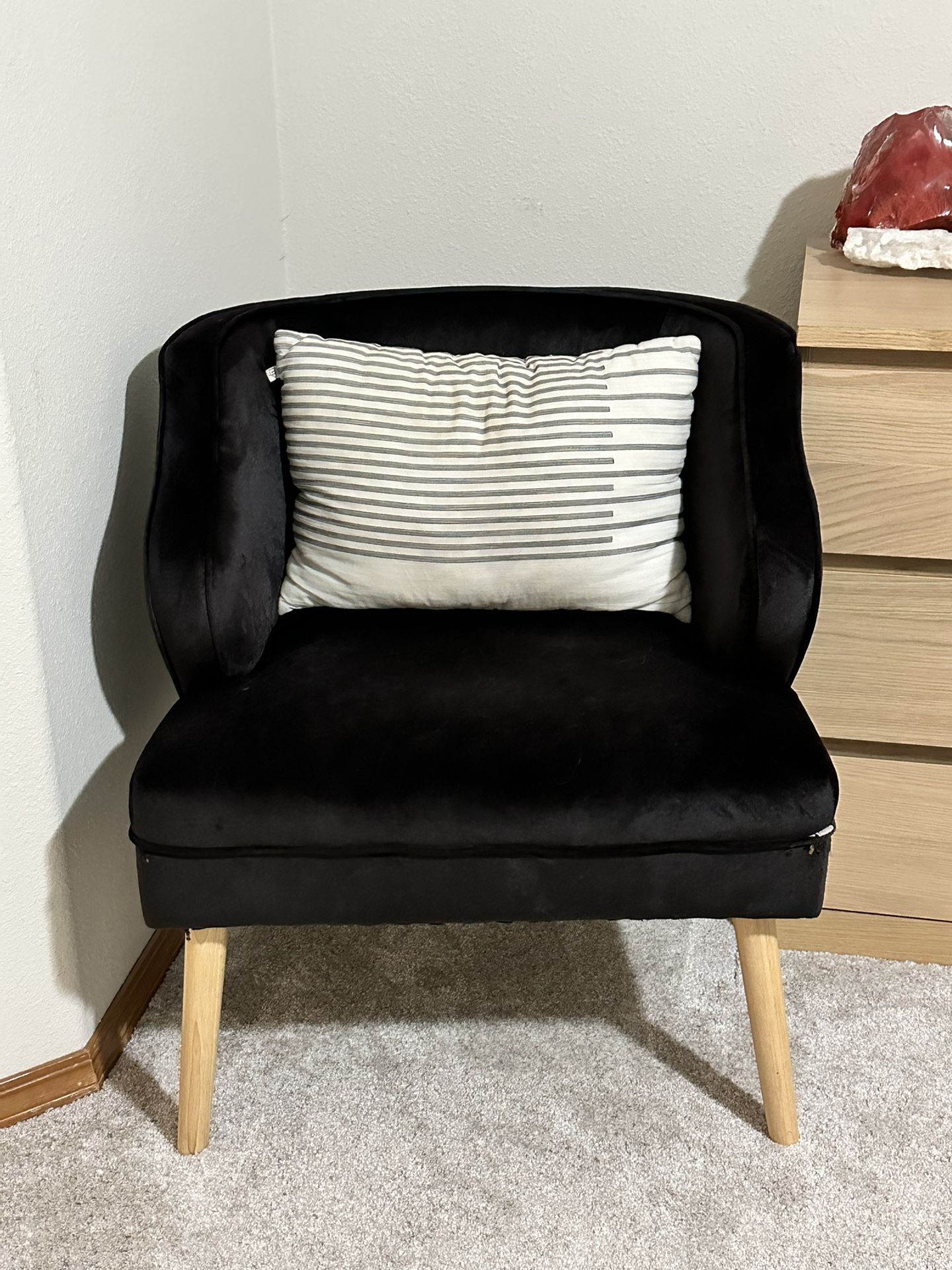 Black velvet accent chair with wooden legs. Very comfortable. The bottom covering has been removed and a small tear on left front corner.