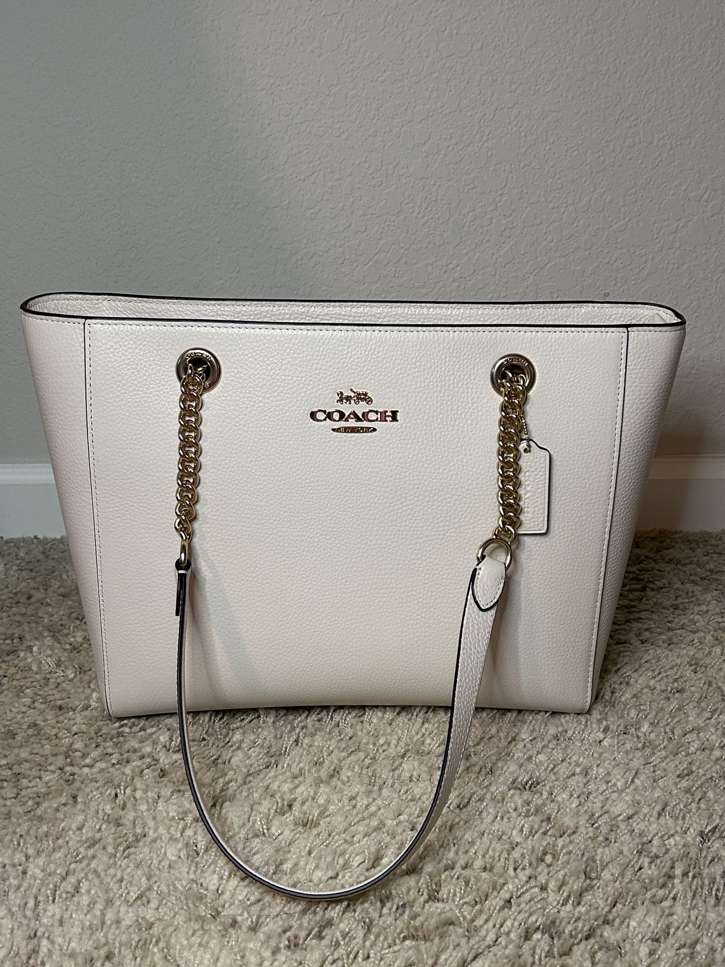 Authentic Coach C1566 Marlie Tote. Chalk white with gold hardware. Pebbled Leather chain shoulder bag. Excellent condition. Only used a handful of times. Small white mark on top edge (pictured) & a small smudge on the inside of outside pocket (pictured) Inside zip, cell phone and multifunction pockets Zip-top closure, fabric lining Outside open pocket Four protective feet at base 15”(L) x 10 1/2” (H) x 5 1/2”(W) Accepting offers.