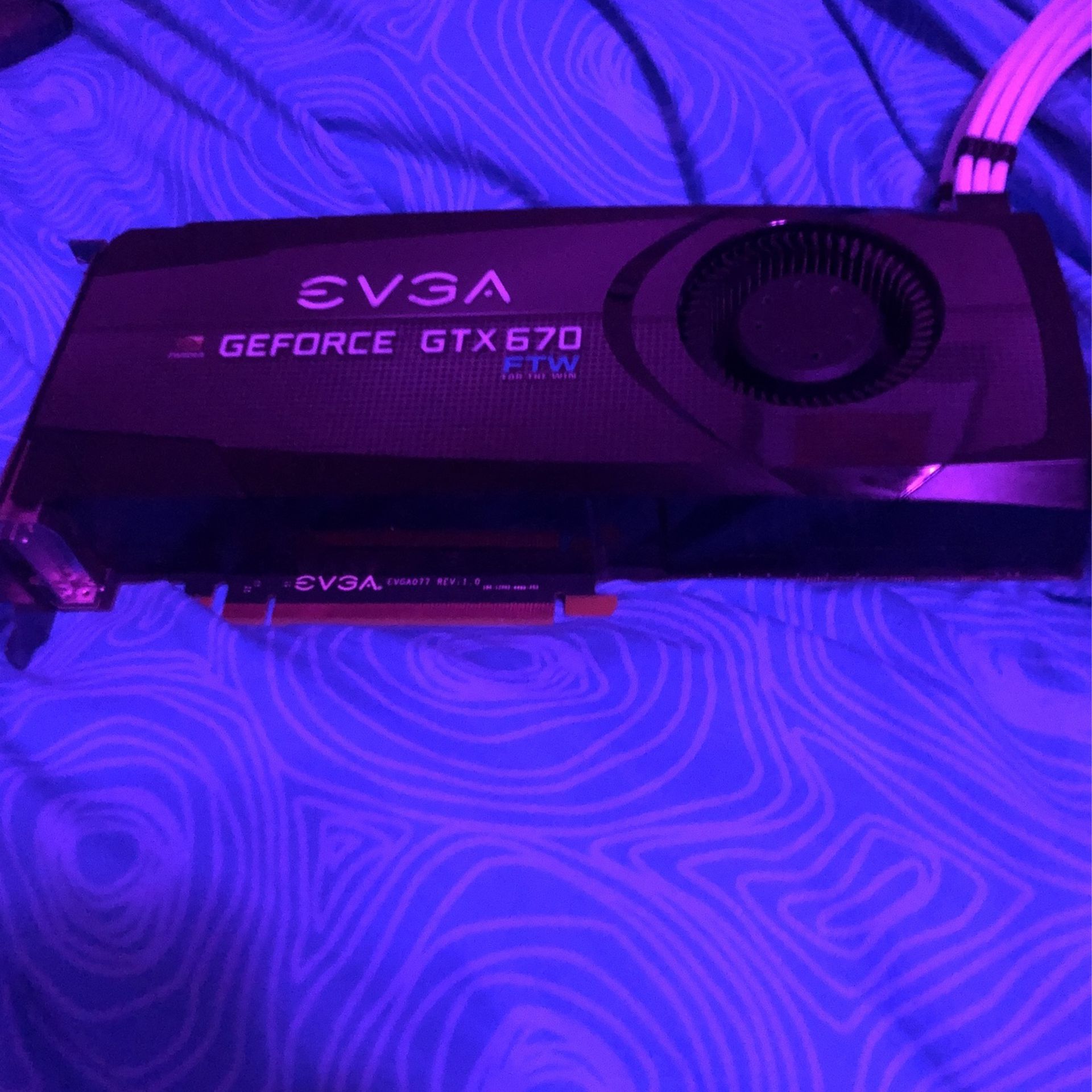 Gtx 670 From EVGA. Still holds up today and great for an entry level ALSO INCLUDES SLEVED CABLES FORTNITE = 65fps VALORANT = 80fps CS:GO = 75fps ROGUE COMPANY = 60fps Great for just getting started in gaming on the cheap, with playable frame rates