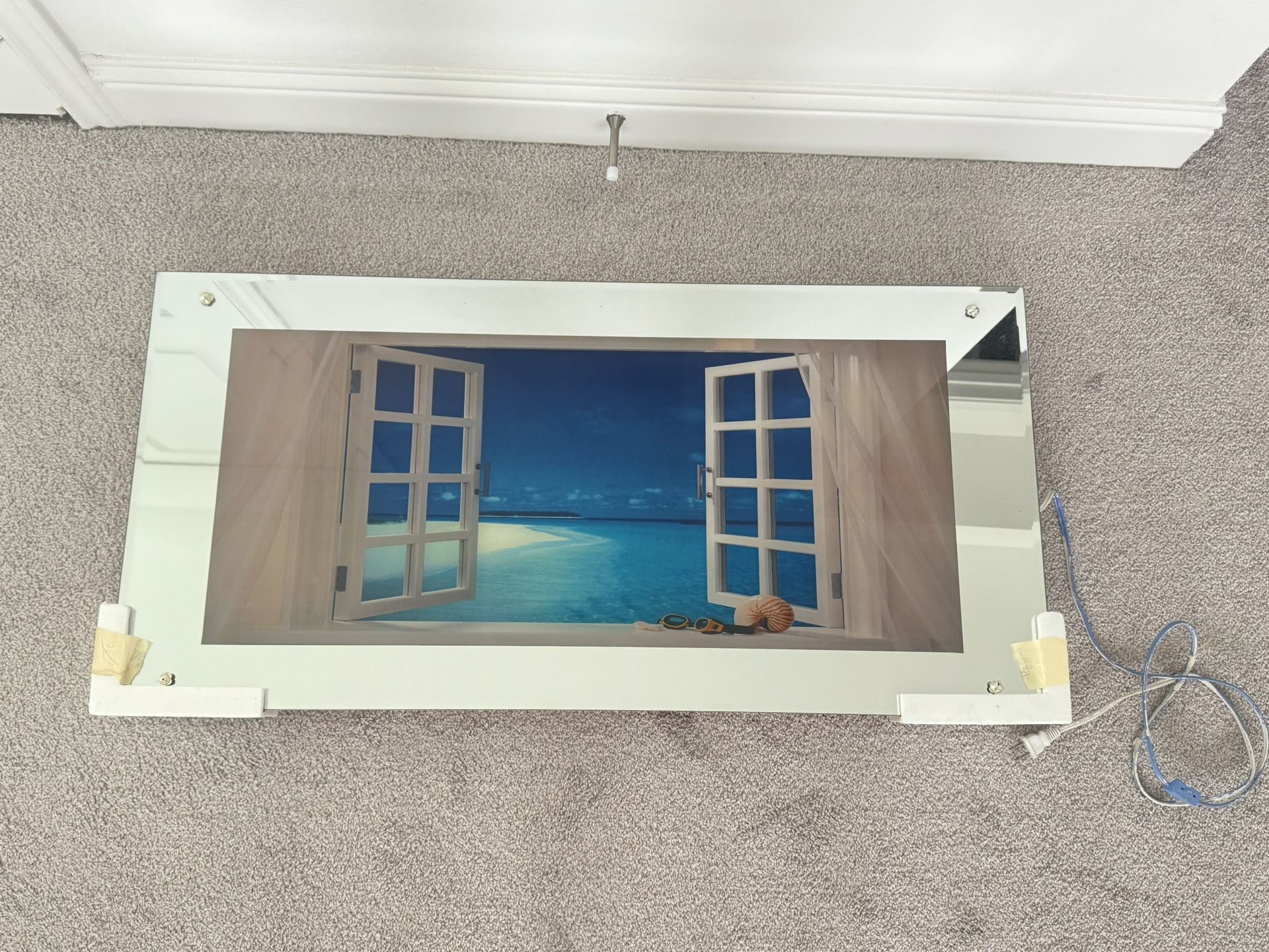 Large decorative wall art with a relaxing ocean wave scene. The image shows moving waves and includes an optional wave sound with an on/off button. Mirror border frame. Features: β’ Moving ocean wave display π β’ Wave sound on/off button π β’ Mirror frame border β’ Size: 38.5β x 19.5β Condition: Good working condition.