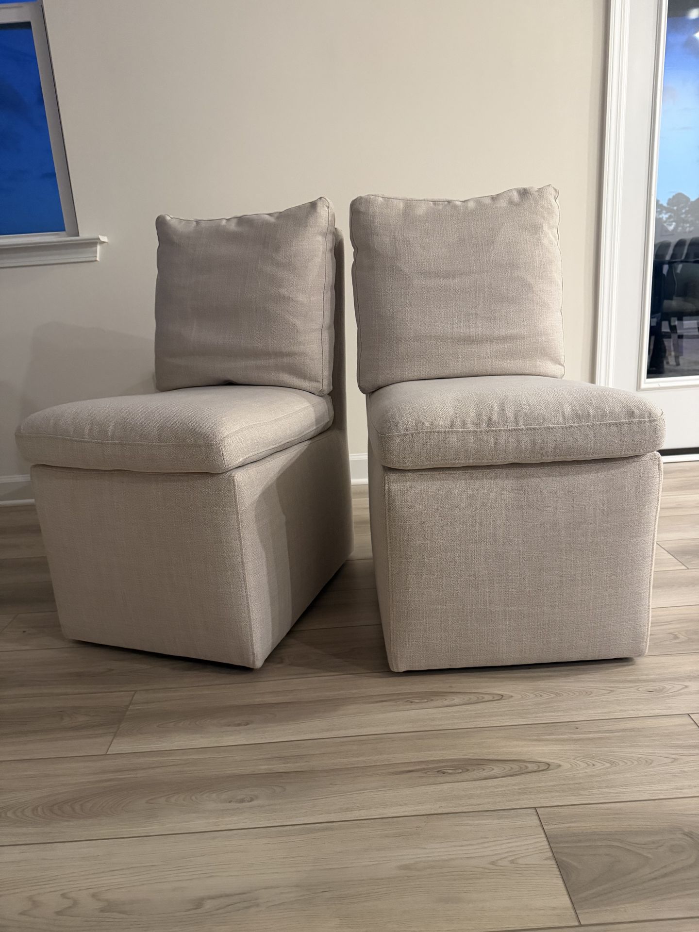 Linen color, upholstered, back pillow attached. Sold as a pair. Pick-up only.