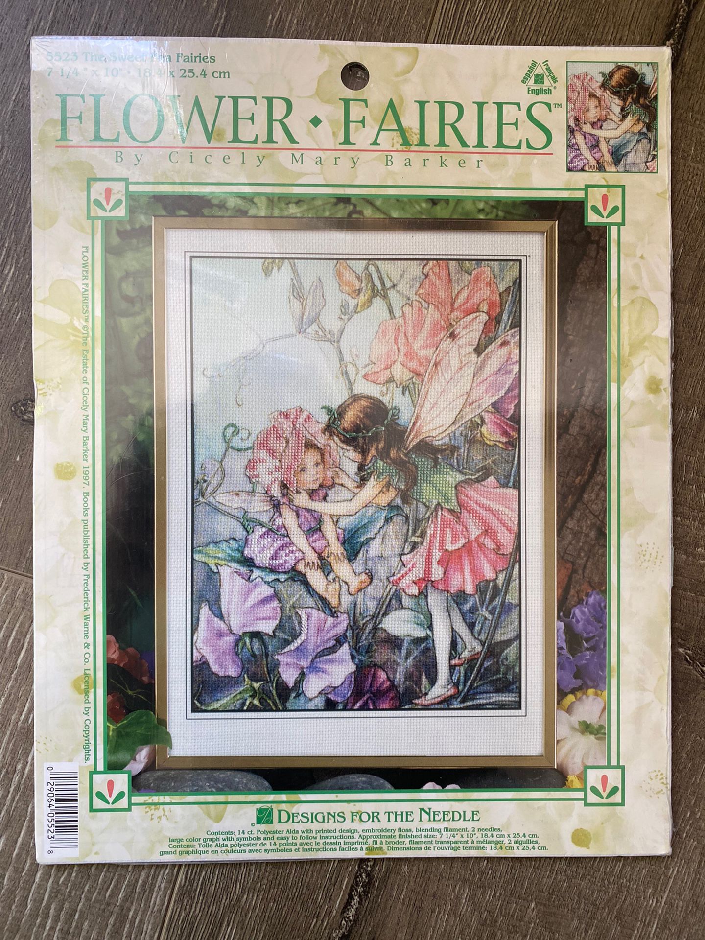 7 1/4” x 10” complete cross stitch kit. Unopened kit 5523 The Sweet Pea Fairies by Cicely Mary Barker