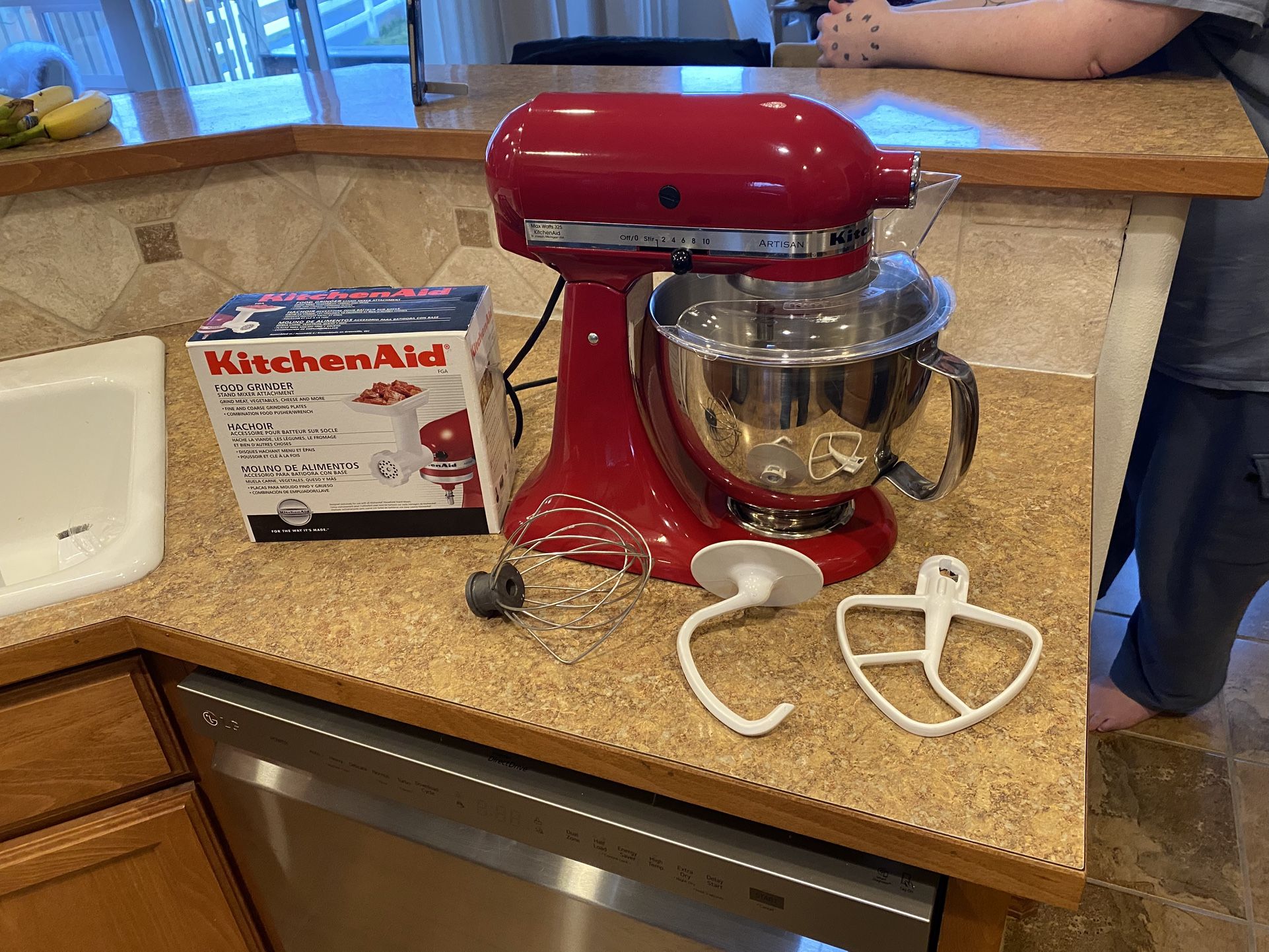 Artisan Model KSM150PSER with the Food Grinder attachment. Includes splash guard, paddle, hook and whisk. 5 quart stainless bowl, tilt head. If it’s listed, it’s available. I won’t respond to “Is it available?”