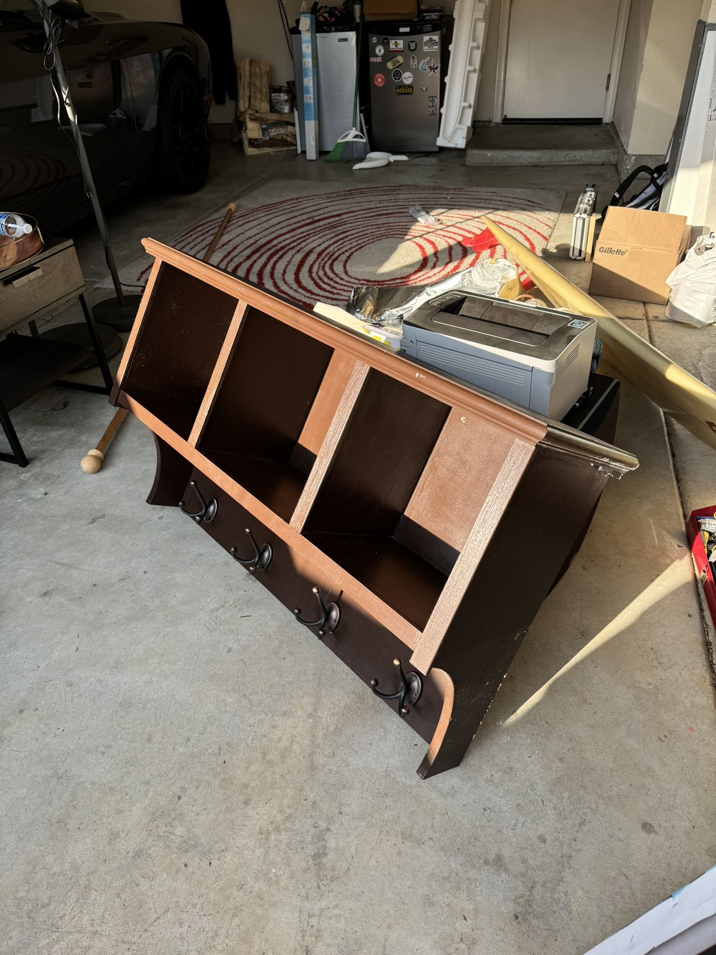 Would need to be drilled into the wooden studs of a wall. Very sturdy. Has normal wear and tear. No dents or broken wood.