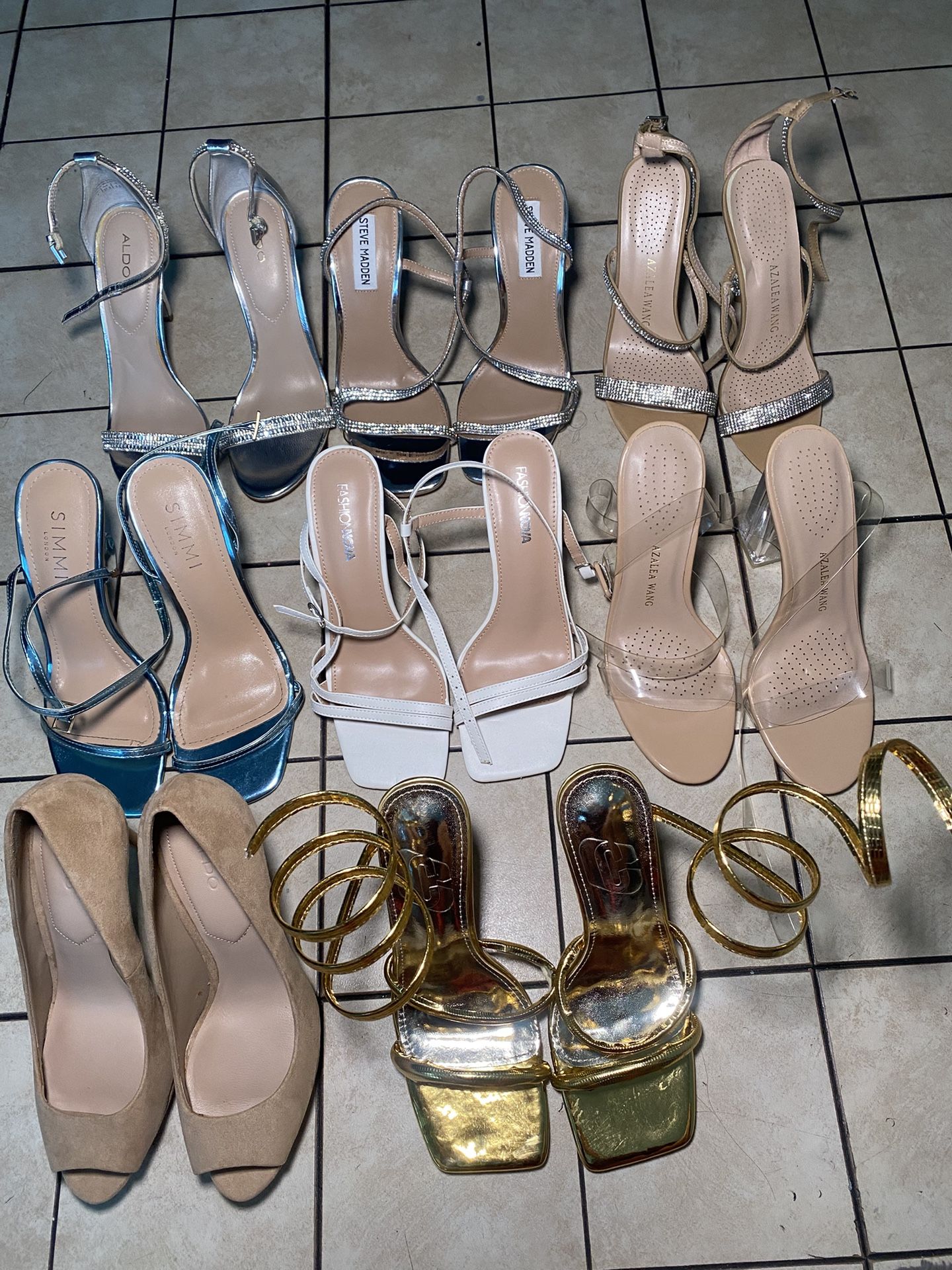 8 pairs of heels from Simmi, fashion nova, Steve Madden ,akira,Aldo, etc. If you see a specific heel you want please message me. Otherwise they will all be sold together. Some have never been worn before others are normal wear . Willing to negotiate.