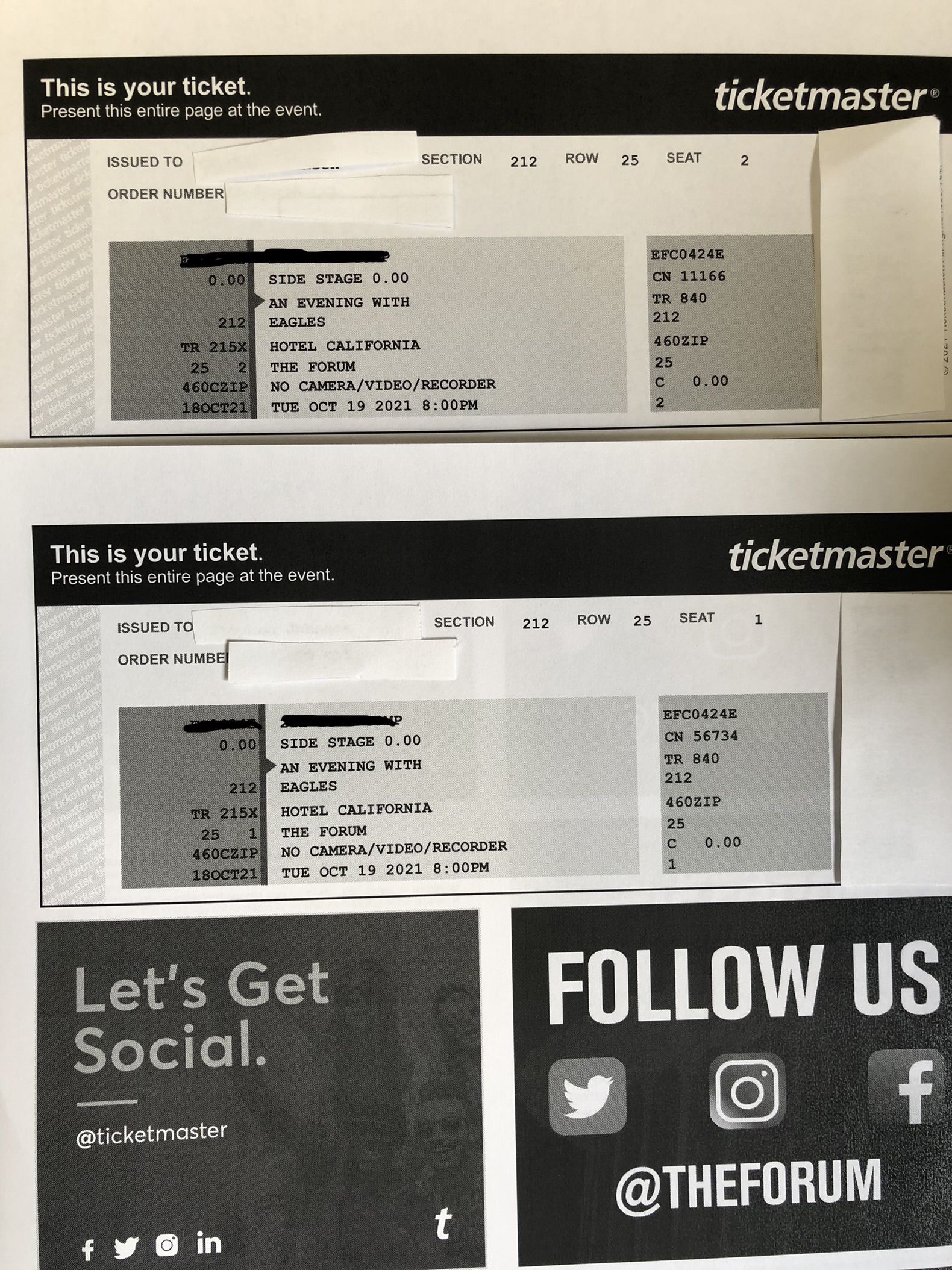 2 tickets to see the Eagles at their Hotel California Tour. Performing tonight (10/19/21) @ The Forum Section 212 Row 25 seats 1&2. $80 each ticket, $160 for both OBO. Ticketmaster transfer or pickup in San Pedro @ hospital. I am selling at face value for these awesome seats. OBO. Had a last minute change of plans and can’t make it - my loss is your gain. Can send via Ticketmaster or pickup of printed tickets.