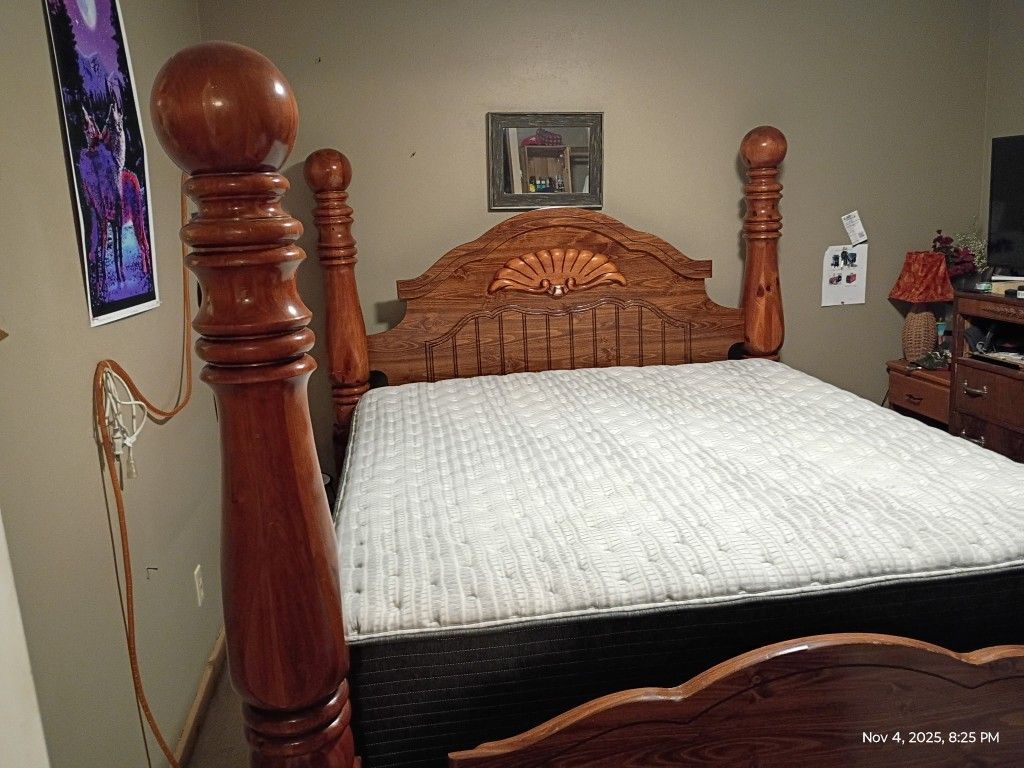 It's a beautiful California king Beauty rest mattress with 4 full box springs. Also has beautifully carved solid mahogany wood posts on all 4 corners and railing on sides. I bought the mattresses brand new and with the mahogany wood I paid $500. I am asking $325 OBO it is worth the cost! It's been very well taken care of. We are moving to a smaller place and as much as I hate to sell it we have to, it's just too big for our small room.